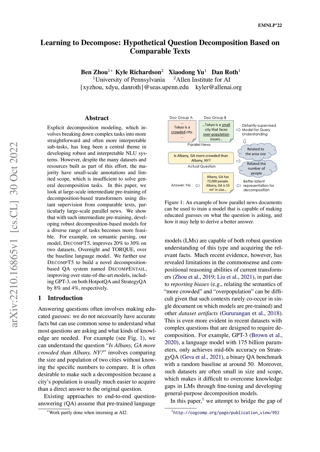 Explicit decomposition modeling, which involves breaking down complex tasks into more straightforward and often more interpretable sub-tasks, has long been a central theme in developing robust and interpretable NLU systems. However, despite the many datasets and resources built as part of this effort, the majority have small-scale annotations and limited scope, which is insufficient to solve general decomposition tasks. In this paper, we look at large-scale intermediate pre-training of decomposition-based transformers using distant supervision from comparable texts, particularly large-scale parallel news. We show that with such intermediate pre-training, developing robust decomposition-based models for a diverse range of tasks becomes more feasible. For example, on semantic parsing, our model, DecompT5, improves 20% to 30% on two datasets, Overnight and TORQUE, over the baseline language model. We further use DecompT5 to build a novel decomposition-based QA system named DecompEntail, improving over state-of-the-art models, including GPT-3, on both HotpotQA and StrategyQA by 8% and 4%, respectively.