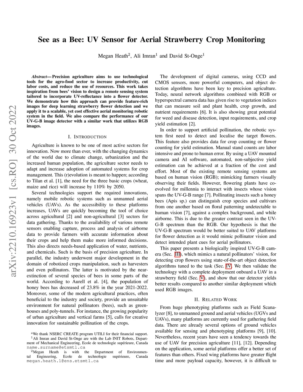 Precision agriculture aims to use technological tools for the agro-food sector to increase productivity, cut labor costs, and reduce the use of resources. This work takes inspiration from bees vision to design a remote sensing system tailored to incorporate UV-reflectance into a flower detector. We demonstrate how this approach can provide feature-rich images for deep learning strawberry flower detection and we apply it to a scalable, yet cost effective aerial monitoring robotic system in the field. We also compare the performance of our UV-G-B image detector with a similar work that utilizes RGB images.