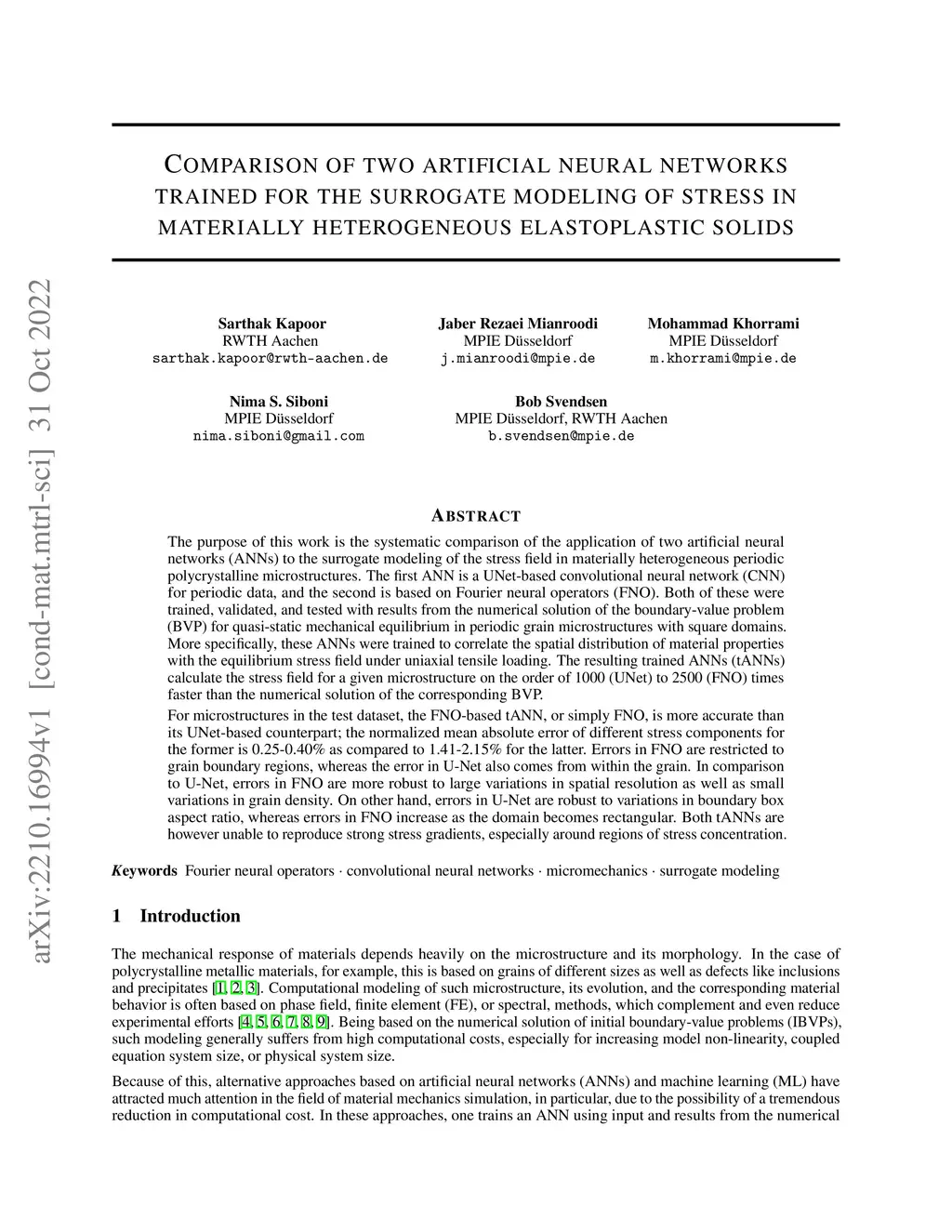 The purpose of this work is the systematic comparison of the application of two artificial neural networks (ANNs) to the surrogate modeling of the stress field in materially heterogeneous periodic polycrystalline microstructures. The first ANN is a UNet-based convolutional neural network (CNN) for periodic data, and the second is based on Fourier neural operators (FNO). Both of these were trained, validated, and tested with results from the numerical solution of the boundary-value problem (BVP) for quasi-static mechanical equilibrium in periodic grain microstructures with square domains. More specifically, these ANNs were trained to correlate the spatial distribution of material properties with the equilibrium stress field under uniaxial tensile loading. The resulting trained ANNs (tANNs) calculate the stress field for a given microstructure on the order of 1000 (UNet) to 2500 (FNO) times faster than the numerical solution of the corresponding BVP. For microstructures in the test dataset, the FNO-based tANN, or simply FNO, is more accurate than its UNet-based counterpart; the normalized mean absolute error of different stress components for the former is 0.25-0.40% as compared to 1.41-2.15% for the latter. Errors in FNO are restricted to grain boundary regions, whereas the error in U-Net also comes from within the grain. In comparison to U-Net, errors in FNO are more robust to large variations in spatial resolution as well as small variations in grain density. On other hand, errors in U-Net are robust to variations in boundary box aspect ratio, whereas errors in FNO increase as the domain becomes rectangular. Both tANNs are however unable to reproduce strong stress gradients, especially around regions of stress concentration.