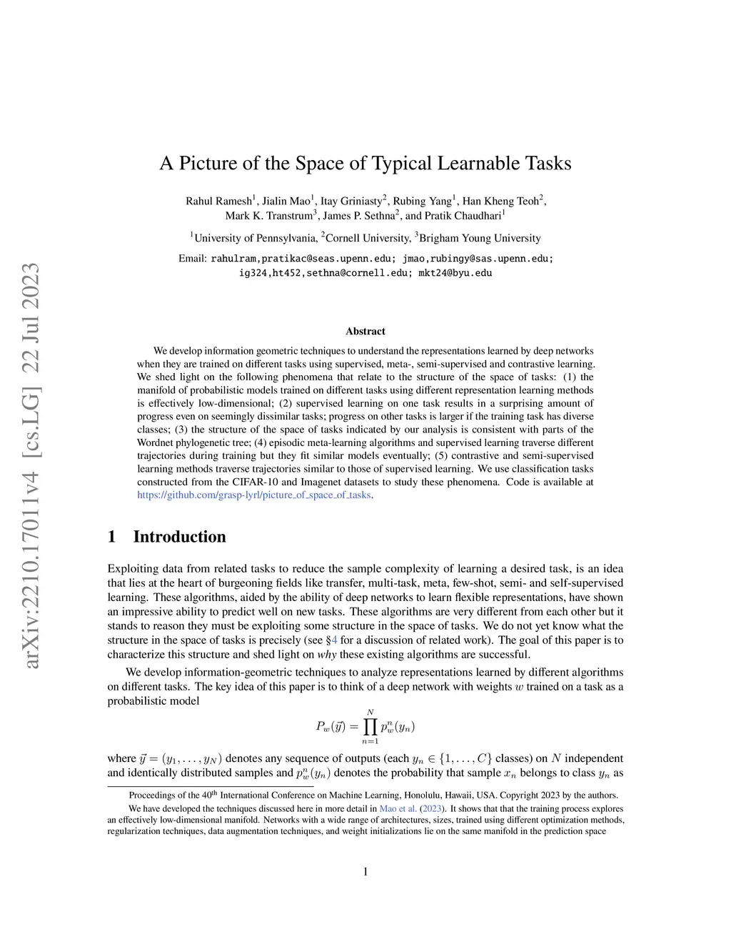 We develop information geometric techniques to understand the representations learned by deep networks when they are trained on different tasks using supervised, meta-, semi-supervised and contrastive learning. We shed light on the following phenomena that relate to the structure of the space of tasks: (1) the manifold of probabilistic models trained on different tasks using different representation learning methods is effectively low-dimensional; (2) supervised learning on one task results in a surprising amount of progress even on seemingly dissimilar tasks; progress on other tasks is larger if the training task has diverse classes; (3) the structure of the space of tasks indicated by our analysis is consistent with parts of the Wordnet phylogenetic tree; (4) episodic meta-learning algorithms and supervised learning traverse different trajectories during training but they fit similar models eventually; (5) contrastive and semi-supervised learning methods traverse trajectories similar to those of supervised learning. We use classification tasks constructed from the CIFAR-10 and Imagenet datasets to study these phenomena.