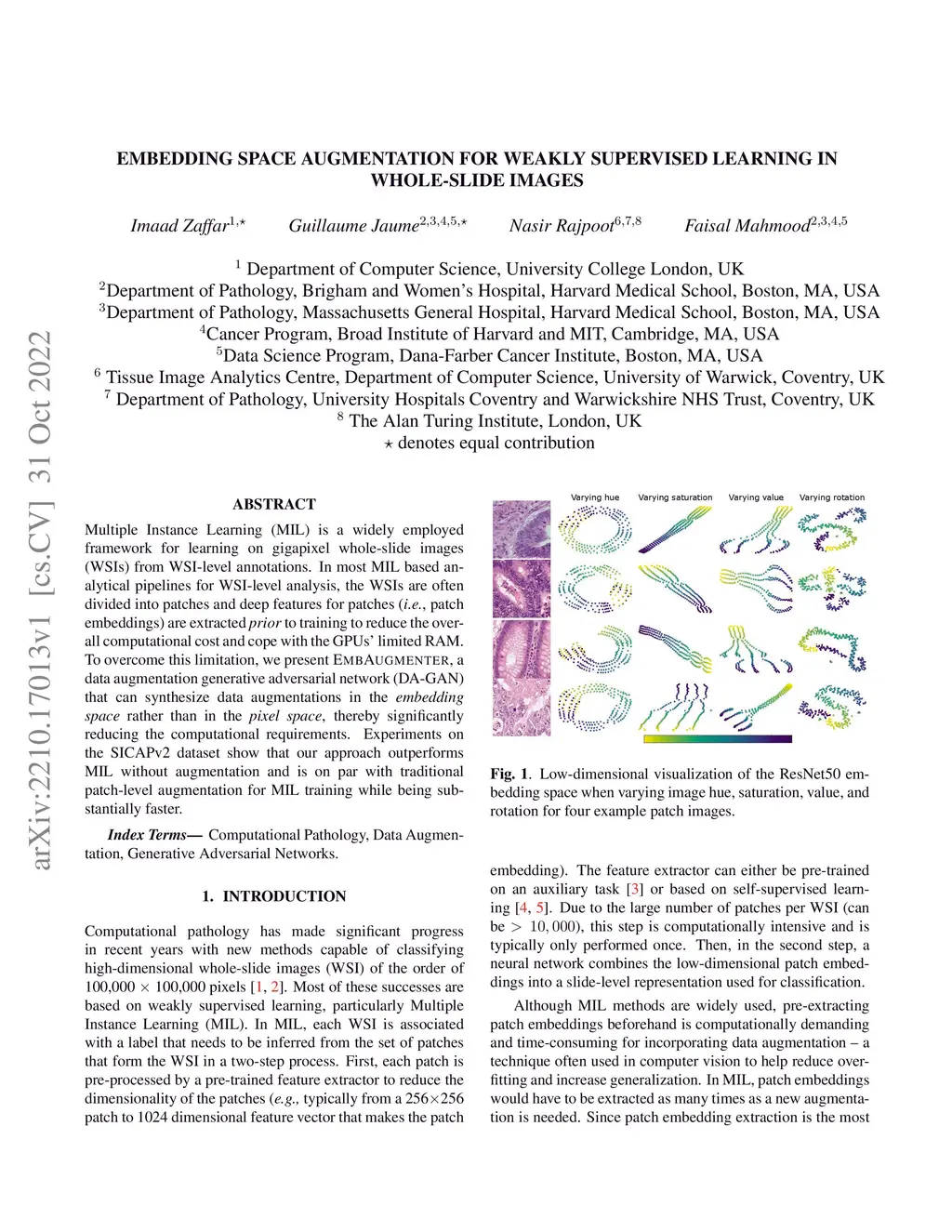 Multiple Instance Learning (MIL) is a widely employed framework for learning on gigapixel whole-slide images (WSIs) from WSI-level annotations. In most MIL based analytical pipelines for WSI-level analysis, the WSIs are often divided into patches and deep features for patches (i.e., patch embeddings) are extracted prior to training to reduce the overall computational cost and cope with the GPUs' limited RAM. To overcome this limitation, we present EmbAugmenter, a data augmentation generative adversarial network (DA-GAN) that can synthesize data augmentations in the embedding space rather than in the pixel space, thereby significantly reducing the computational requirements. Experiments on the SICAPv2 dataset show that our approach outperforms MIL without augmentation and is on par with traditional patch-level augmentation for MIL training while being substantially faster.