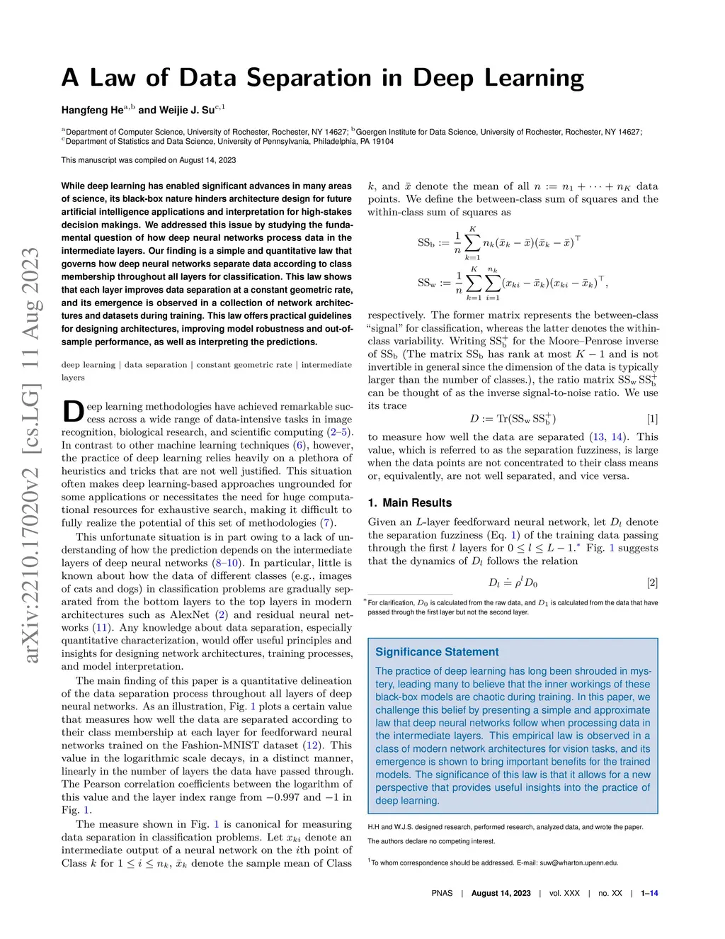 While deep learning has enabled significant advances in many areas of science, its black-box nature hinders architecture design for future artificial intelligence applications and interpretation for high-stakes decision makings. We addressed this issue by studying the fundamental question of how deep neural networks process data in the intermediate layers. Our finding is a simple and quantitative law that governs how deep neural networks separate data according to class membership throughout all layers for classification. This law shows that each layer improves data separation at a constant geometric rate, and its emergence is observed in a collection of network architectures and datasets during training. This law offers practical guidelines for designing architectures, improving model robustness and out-of-sample performance, as well as interpreting the predictions.