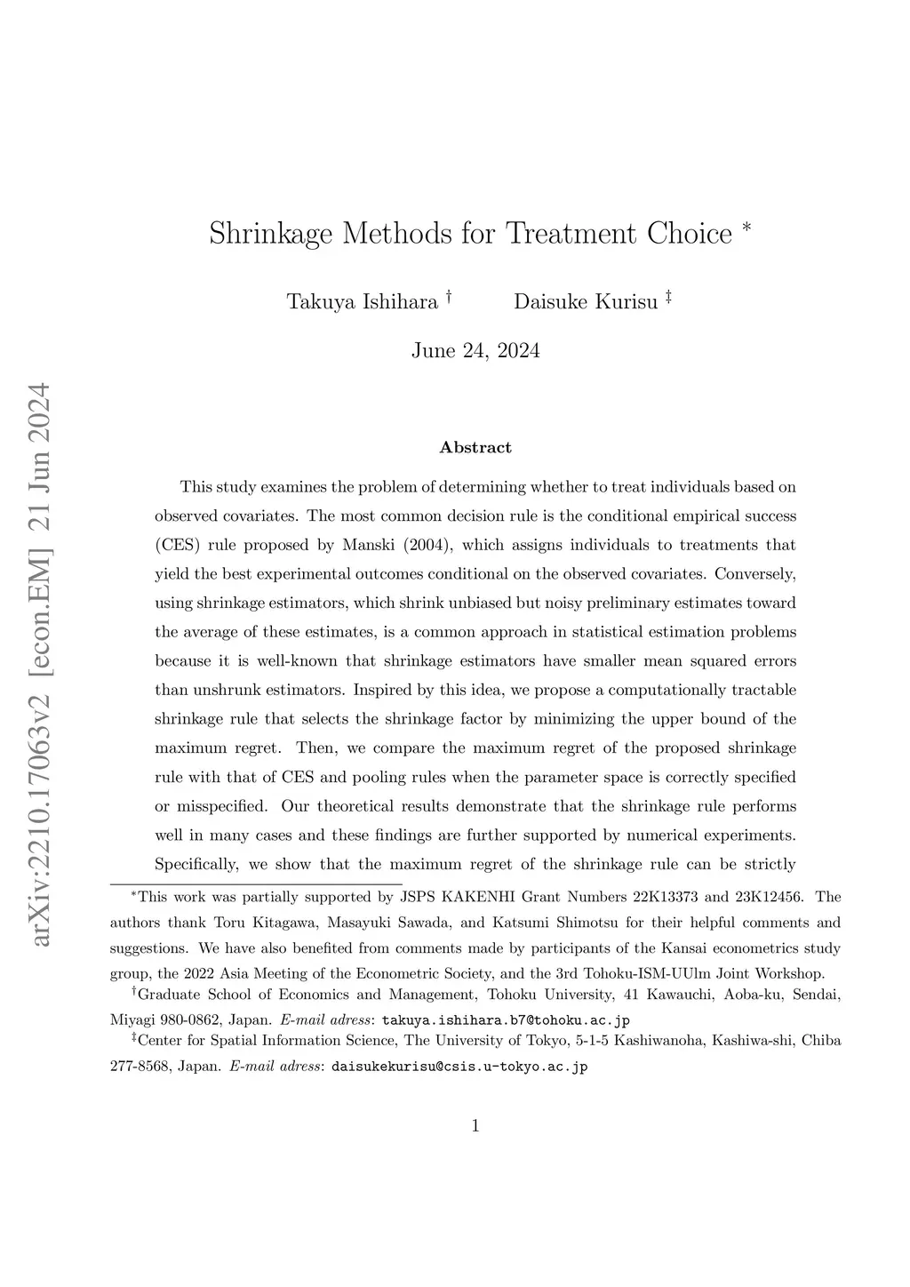 This study examines the problem of determining whether to treat individuals based on observed covariates. The most common decision rule is the conditional empirical success (CES) rule proposed by Manski (2004), which assigns individuals to treatments that yield the best experimental outcomes conditional on the observed covariates. Conversely, using shrinkage estimators, which shrink unbiased but noisy preliminary estimates toward the average of these estimates, is a common approach in statistical estimation problems because it is well-known that shrinkage estimators have smaller mean squared errors than unshrunk estimators. Inspired by this idea, we propose a computationally tractable shrinkage rule that selects the shrinkage factor by minimizing the upper bound of the maximum regret. Then, we compare the maximum regret of the proposed shrinkage rule with that of CES and pooling rules when the parameter space is correctly specified or misspecified. Our theoretical results demonstrate that the shrinkage rule performs well in many cases and these findings are further supported by numerical experiments. Specifically, we show that the maximum regret of the shrinkage rule can be strictly smaller than that of the CES and pooling rules in certain cases when the parameter space is correctly specified. In addition, we find that the shrinkage rule is robust against misspecifications of the parameter space. Finally, we apply our method to experimental data from the National Job Training Partnership Act Study.