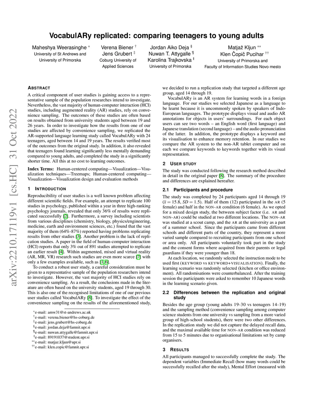 A critical component of user studies is gaining access to a representative sample of the population researches intend to investigate. Nevertheless, the vast majority of human-computer interaction (HCI)studies, including augmented reality (AR) studies, rely on convenience sampling. The outcomes of these studies are often based on results obtained from university students aged between 19 and 26 years. In order to investigate how the results from one of our studies are affected by convenience sampling, we replicated the AR-supported language learning study called VocabulARy with 24 teenagers, aged between 14 and 19 years. The results verified most of the outcomes from the original study. In addition, it also revealed that teenagers found learning significantly less mentally demanding compared to young adults, and completed the study in a significantly shorter time. All this at no cost to learning outcomes.