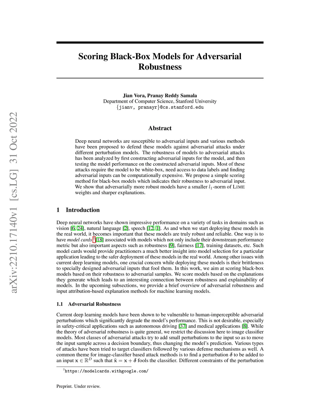 Deep neural networks are susceptible to adversarial inputs and various methods have been proposed to defend these models against adversarial attacks under different perturbation models. The robustness of models to adversarial attacks has been analyzed by first constructing adversarial inputs for the model, and then testing the model performance on the constructed adversarial inputs. Most of these attacks require the model to be white-box, need access to data labels, and finding adversarial inputs can be computationally expensive. We propose a simple scoring method for black-box models which indicates their robustness to adversarial input. We show that adversarially more robust models have a smaller -norm of LIME weights and sharper explanations.
