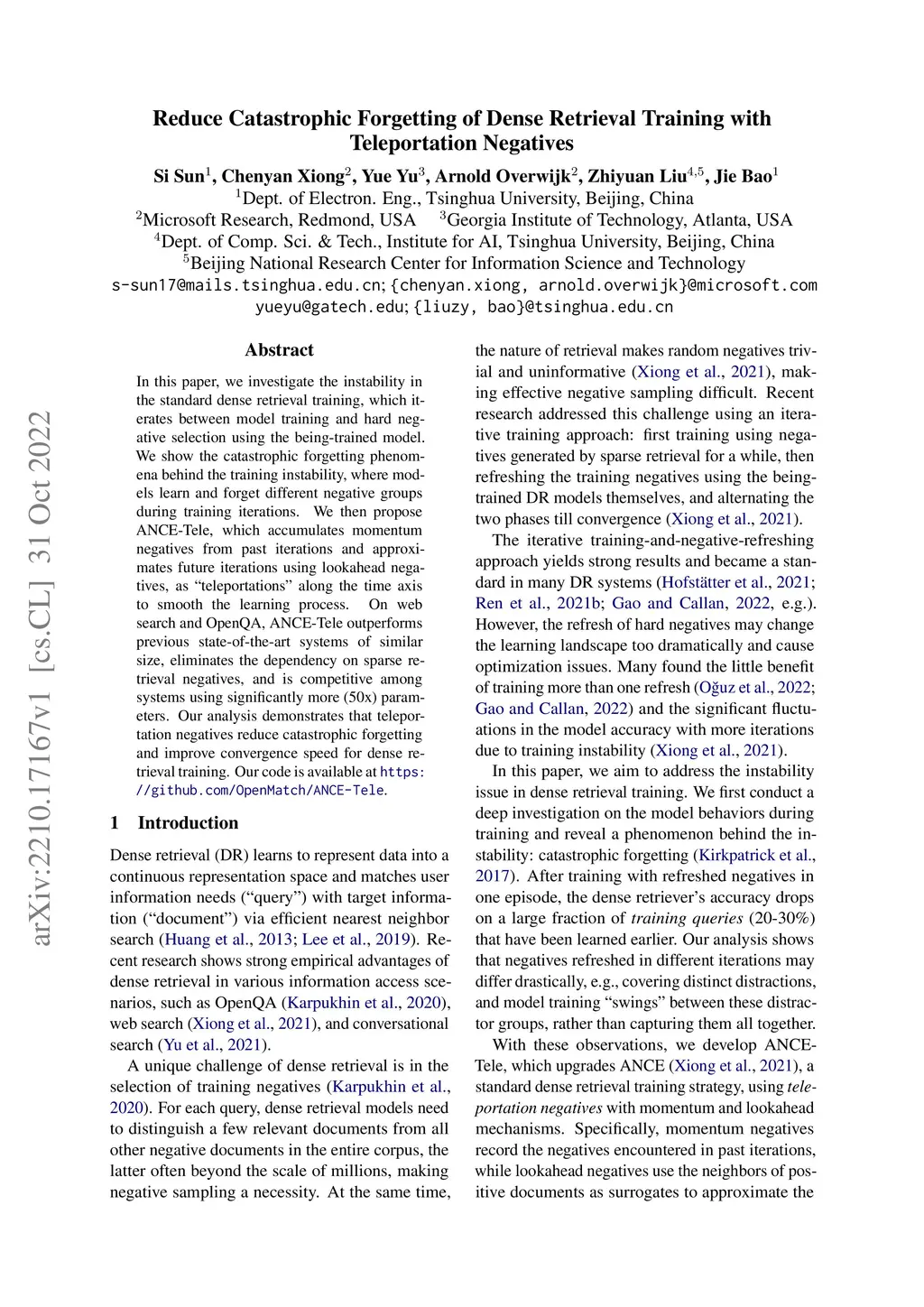 In this paper, we investigate the instability in the standard dense retrieval training, which iterates between model training and hard negative selection using the being-trained model. We show the catastrophic forgetting phenomena behind the training instability, where models learn and forget different negative groups during training iterations. We then propose ANCE-Tele, which accumulates momentum negatives from past iterations and approximates future iterations using lookahead negatives, as "teleportations" along the time axis to smooth the learning process. On web search and OpenQA, ANCE-Tele outperforms previous state-of-the-art systems of similar size, eliminates the dependency on sparse retrieval negatives, and is competitive among systems using significantly more (50x) parameters. Our analysis demonstrates that teleportation negatives reduce catastrophic forgetting and improve convergence speed for dense retrieval training. Our code is available at https://github.com/OpenMatch/ANCE-Tele.