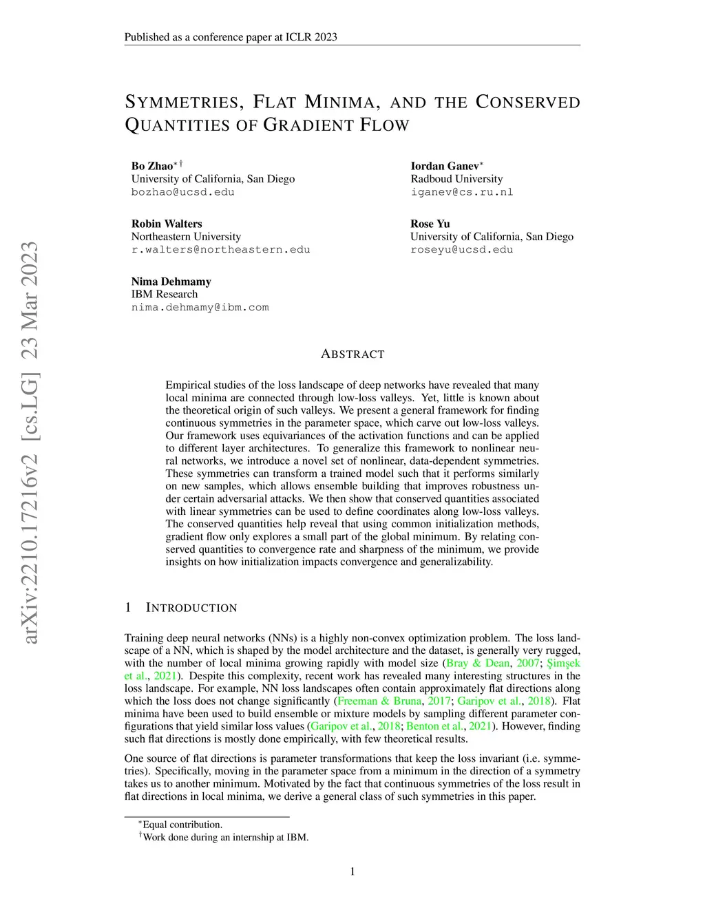 Empirical studies of the loss landscape of deep networks have revealed that many local minima are connected through low-loss valleys. Yet, little is known about the theoretical origin of such valleys. We present a general framework for finding continuous symmetries in the parameter space, which carve out low-loss valleys. Our framework uses equivariances of the activation functions and can be applied to different layer architectures. To generalize this framework to nonlinear neural networks, we introduce a novel set of nonlinear, data-dependent symmetries. These symmetries can transform a trained model such that it performs similarly on new samples, which allows ensemble building that improves robustness under certain adversarial attacks. We then show that conserved quantities associated with linear symmetries can be used to define coordinates along low-loss valleys. The conserved quantities help reveal that using common initialization methods, gradient flow only explores a small part of the global minimum. By relating conserved quantities to convergence rate and sharpness of the minimum, we provide insights on how initialization impacts convergence and generalizability.