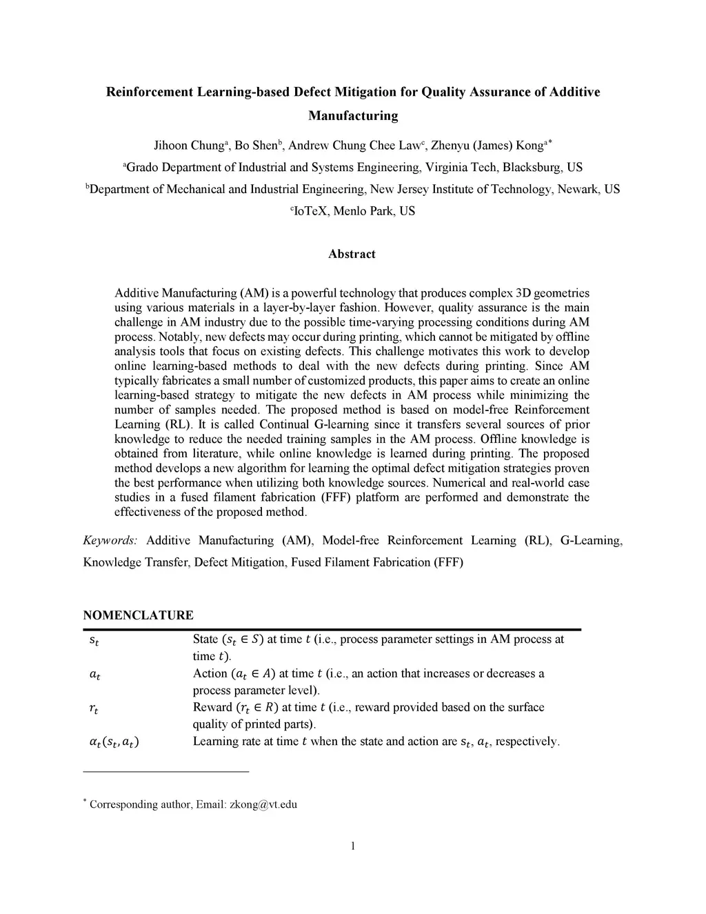 Additive Manufacturing (AM) is a powerful technology that produces complex 3D geometries using various materials in a layer-by-layer fashion. However, quality assurance is the main challenge in AM industry due to the possible time-varying processing conditions during AM process. Notably, new defects may occur during printing, which cannot be mitigated by offline analysis tools that focus on existing defects. This challenge motivates this work to develop online learning-based methods to deal with the new defects during printing. Since AM typically fabricates a small number of customized products, this paper aims to create an online learning-based strategy to mitigate the new defects in AM process while minimizing the number of samples needed. The proposed method is based on model-free Reinforcement Learning (RL). It is called Continual G-learning since it transfers several sources of prior knowledge to reduce the needed training samples in the AM process. Offline knowledge is obtained from literature, while online knowledge is learned during printing. The proposed method develops a new algorithm for learning the optimal defect mitigation strategies proven the best performance when utilizing both knowledge sources. Numerical and real-world case studies in a fused filament fabrication (FFF) platform are performed and demonstrate the effectiveness of the proposed method.