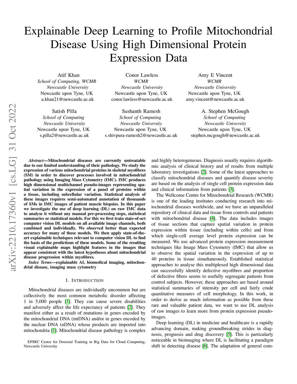 Mitochondrial diseases are currently untreatable due to our limited understanding of their pathology. We study the expression of various mitochondrial proteins in skeletal myofibres (SM) in order to discover processes involved in mitochondrial pathology using Imaging Mass Cytometry (IMC). IMC produces high dimensional multichannel pseudo-images representing spatial variation in the expression of a panel of proteins within a tissue, including subcellular variation. Statistical analysis of these images requires semi-automated annotation of thousands of SMs in IMC images of patient muscle biopsies. In this paper we investigate the use of deep learning (DL) on raw IMC data to analyse it without any manual pre-processing steps, statistical summaries or statistical models. For this we first train state-of-art computer vision DL models on all available image channels, both combined and individually. We observed better than expected accuracy for many of these models. We then apply state-of-the-art explainable techniques relevant to computer vision DL to find the basis of the predictions of these models. Some of the resulting visual explainable maps highlight features in the images that appear consistent with the latest hypotheses about mitochondrial disease progression within myofibres.