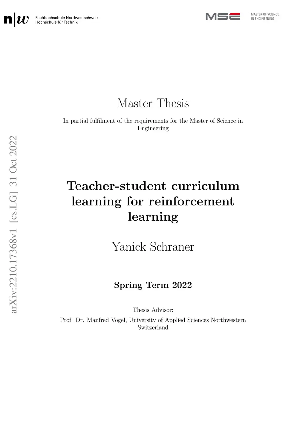 Reinforcement learning (rl) is a popular paradigm for sequential decision making problems. The past decade's advances in rl have led to breakthroughs in many challenging domains such as video games, board games, robotics, and chip design. The sample inefficiency of deep reinforcement learning methods is a significant obstacle when applying rl to real-world problems. Transfer learning has been applied to reinforcement learning such that the knowledge gained in one task can be applied when training in a new task. Curriculum learning is concerned with sequencing tasks or data samples such that knowledge can be transferred between those tasks to learn a target task that would otherwise be too difficult to solve. Designing a curriculum that improves sample efficiency is a complex problem. In this thesis, we propose a teacher-student curriculum learning setting where we simultaneously train a teacher that selects tasks for the student while the student learns how to solve the selected task. Our method is independent of human domain knowledge and manual curriculum design. We evaluated our methods on two reinforcement learning benchmarks: grid world and the challenging Google Football environment. With our method, we can improve the sample efficiency and generality of the student compared to tabula-rasa reinforcement learning.