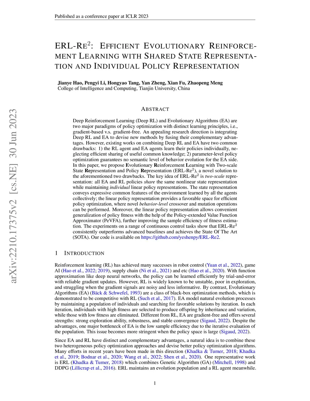 Deep Reinforcement Learning (Deep RL) and Evolutionary Algorithms (EA) are two major paradigms of policy optimization with distinct learning principles, i.e., gradient-based v.s. gradient-free. An appealing research direction is integrating Deep RL and EA to devise new methods by fusing their complementary advantages. However, existing works on combining Deep RL and EA have two common drawbacks: 1) the RL agent and EA agents learn their policies individually, neglecting efficient sharing of useful common knowledge; 2) parameter-level policy optimization guarantees no semantic level of behavior evolution for the EA side. In this paper, we propose Evolutionary Reinforcement Learning with Two-scale State Representation and Policy Representation (ERL-Re), a novel solution to the aforementioned two drawbacks. The key idea of ERL-Re is two-scale representation: all EA and RL policies share the same nonlinear state representation while maintaining individual} linear policy representations. The state representation conveys expressive common features of the environment learned by all the agents collectively; the linear policy representation provides a favorable space for efficient policy optimization, where novel behavior-level crossover and mutation operations can be performed. Moreover, the linear policy representation allows convenient generalization of policy fitness with the help of the Policy-extended Value Function Approximator (PeVFA), further improving the sample efficiency of fitness estimation. The experiments on a range of continuous control tasks show that ERL-Re consistently outperforms advanced baselines and achieves the State Of The Art (SOTA). Our code is available on https://github.com/yeshenpy/ERL-Re2.
