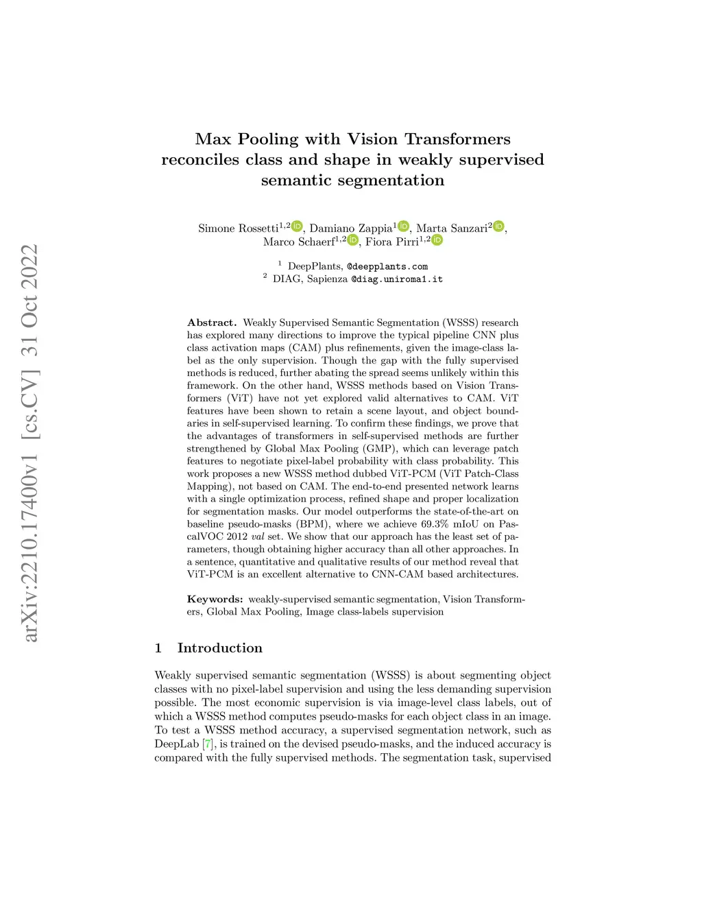 Weakly Supervised Semantic Segmentation (WSSS) research has explored many directions to improve the typical pipeline CNN plus class activation maps (CAM) plus refinements, given the image-class label as the only supervision. Though the gap with the fully supervised methods is reduced, further abating the spread seems unlikely within this framework. On the other hand, WSSS methods based on Vision Transformers (ViT) have not yet explored valid alternatives to CAM. ViT features have been shown to retain a scene layout, and object boundaries in self-supervised learning. To confirm these findings, we prove that the advantages of transformers in self-supervised methods are further strengthened by Global Max Pooling (GMP), which can leverage patch features to negotiate pixel-label probability with class probability. This work proposes a new WSSS method dubbed ViT-PCM (ViT Patch-Class Mapping), not based on CAM. The end-to-end presented network learns with a single optimization process, refined shape and proper localization for segmentation masks. Our model outperforms the state-of-the-art on baseline pseudo-masks (BPM), where we achieve mIoU on PascalVOC 2012 set. We show that our approach has the least set of parameters, though obtaining higher accuracy than all other approaches. In a sentence, quantitative and qualitative results of our method reveal that ViT-PCM is an excellent alternative to CNN-CAM based architectures.
