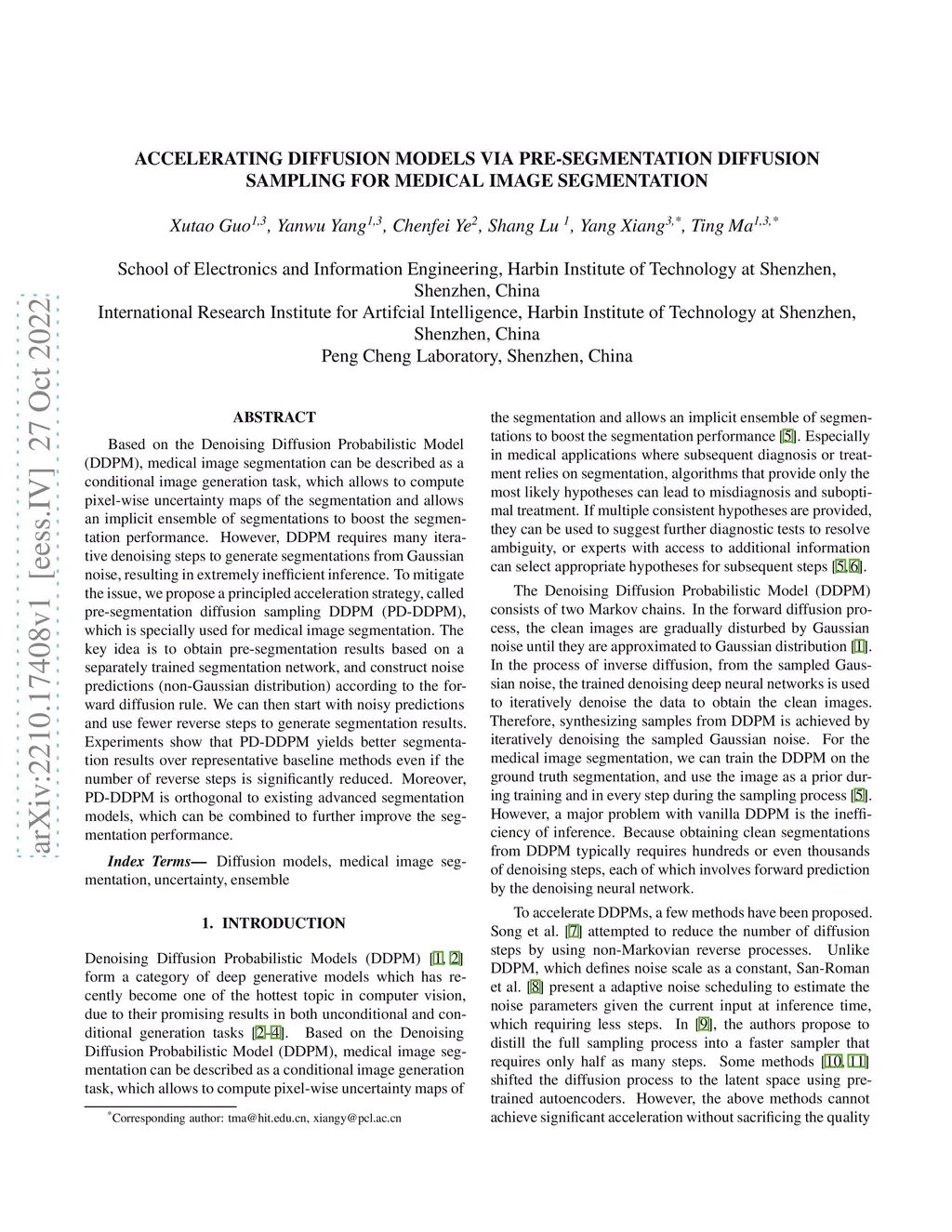 Based on the Denoising Diffusion Probabilistic Model (DDPM), medical image segmentation can be described as a conditional image generation task, which allows to compute pixel-wise uncertainty maps of the segmentation and allows an implicit ensemble of segmentations to boost the segmentation performance. However, DDPM requires many iterative denoising steps to generate segmentations from Gaussian noise, resulting in extremely inefficient inference. To mitigate the issue, we propose a principled acceleration strategy, called pre-segmentation diffusion sampling DDPM (PD-DDPM), which is specially used for medical image segmentation. The key idea is to obtain pre-segmentation results based on a separately trained segmentation network, and construct noise predictions (non-Gaussian distribution) according to the forward diffusion rule. We can then start with noisy predictions and use fewer reverse steps to generate segmentation results. Experiments show that PD-DDPM yields better segmentation results over representative baseline methods even if the number of reverse steps is significantly reduced. Moreover, PD-DDPM is orthogonal to existing advanced segmentation models, which can be combined to further improve the segmentation performance.