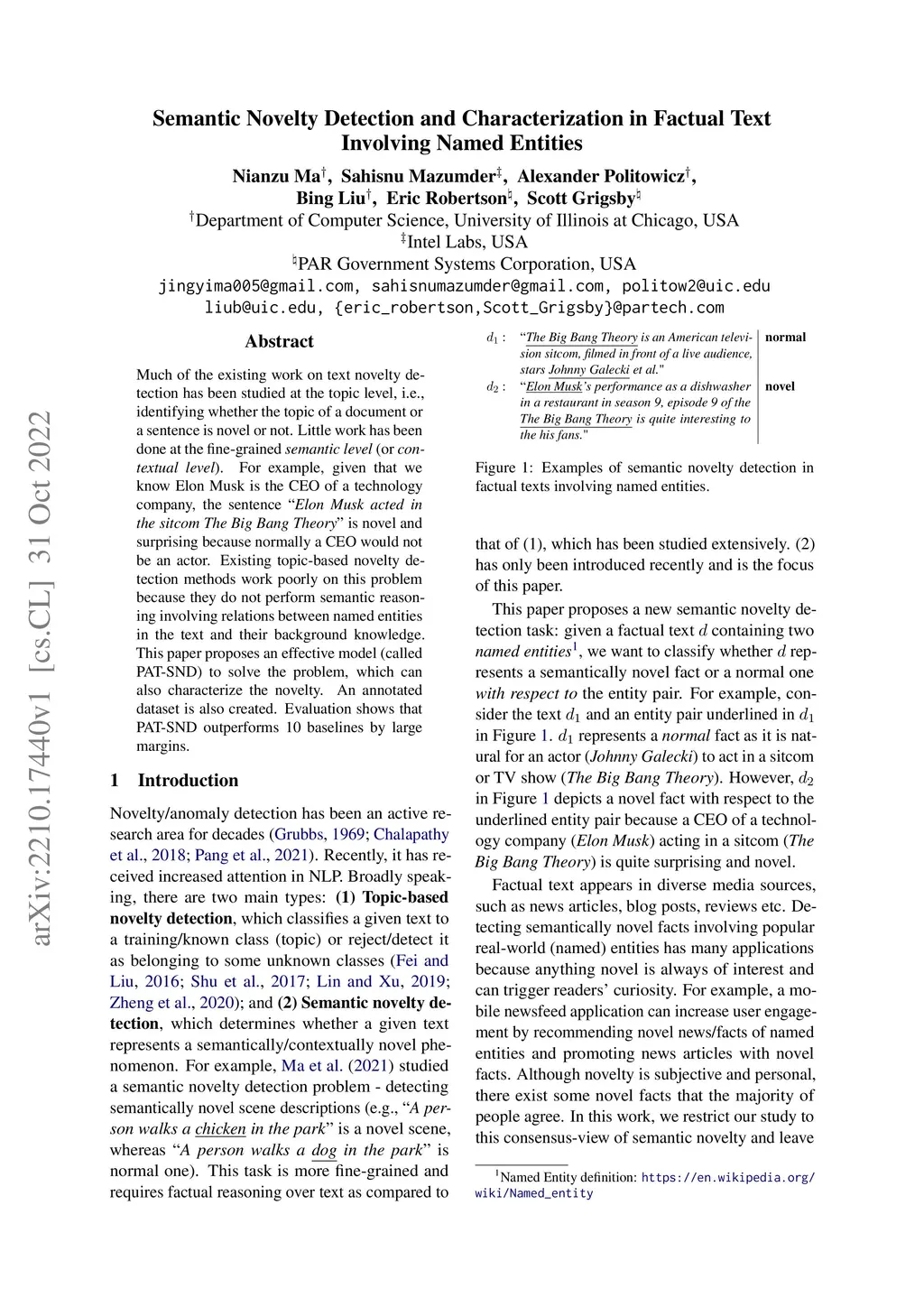 Much of the existing work on text novelty detection has been studied at the topic level, i.e., identifying whether the topic of a document or a sentence is novel or not. Little work has been done at the fine-grained semantic level (or contextual level). For example, given that we know Elon Musk is the CEO of a technology company, the sentence "Elon Musk acted in the sitcom The Big Bang Theory" is novel and surprising because normally a CEO would not be an actor. Existing topic-based novelty detection methods work poorly on this problem because they do not perform semantic reasoning involving relations between named entities in the text and their background knowledge. This paper proposes an effective model (called PAT-SND) to solve the problem, which can also characterize the novelty. An annotated dataset is also created. Evaluation shows that PAT-SND outperforms 10 baselines by large margins.