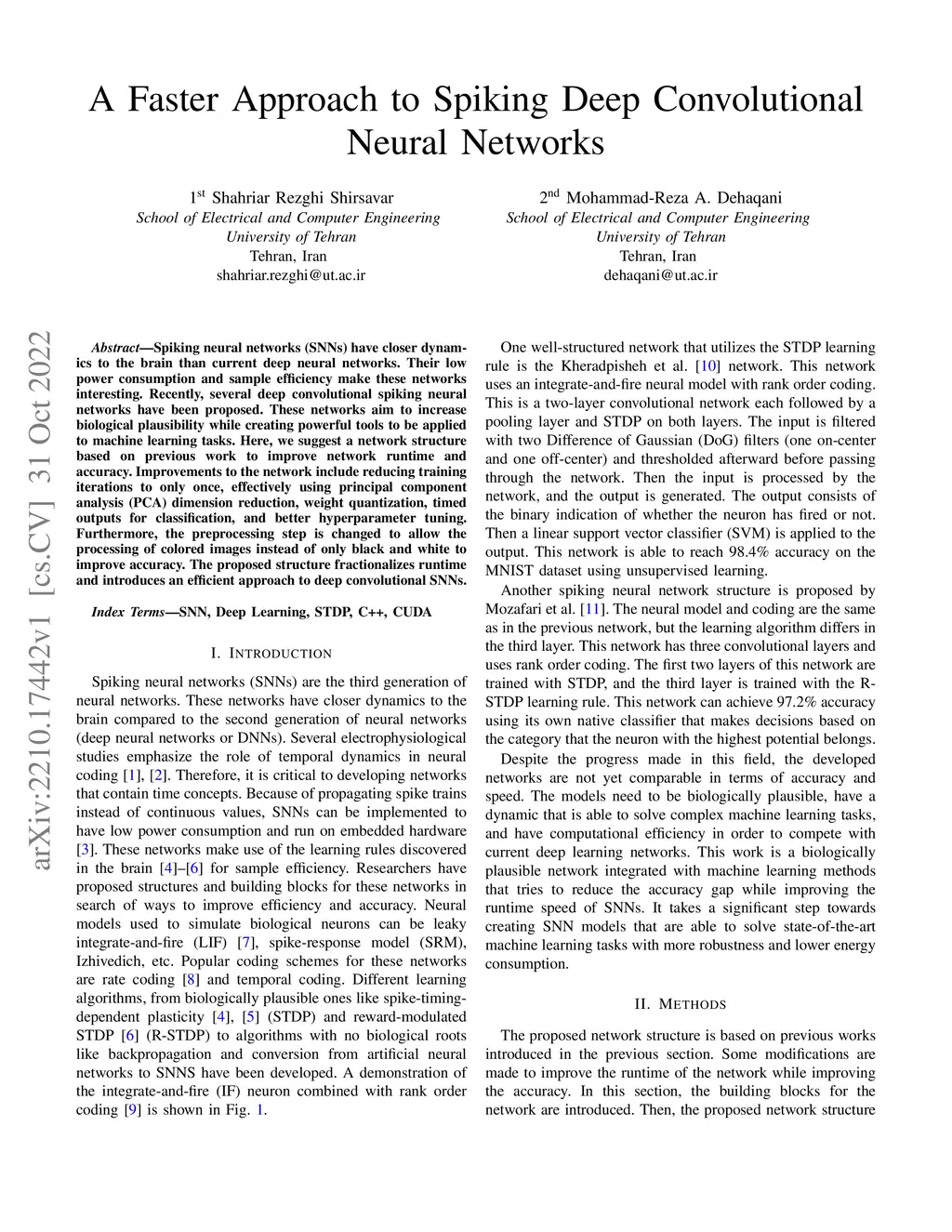 Spiking neural networks (SNNs) have closer dynamics to the brain than current deep neural networks. Their low power consumption and sample efficiency make these networks interesting. Recently, several deep convolutional spiking neural networks have been proposed. These networks aim to increase biological plausibility while creating powerful tools to be applied to machine learning tasks. Here, we suggest a network structure based on previous work to improve network runtime and accuracy. Improvements to the network include reducing training iterations to only once, effectively using principal component analysis (PCA) dimension reduction, weight quantization, timed outputs for classification, and better hyperparameter tuning. Furthermore, the preprocessing step is changed to allow the processing of colored images instead of only black and white to improve accuracy. The proposed structure fractionalizes runtime and introduces an efficient approach to deep convolutional SNNs.