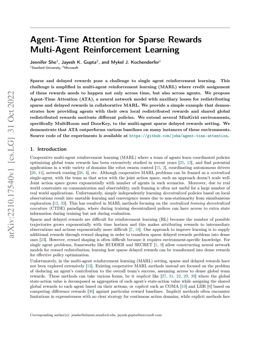 Agent-Time Attention for Sparse Rewards Multi-Agent Reinforcement