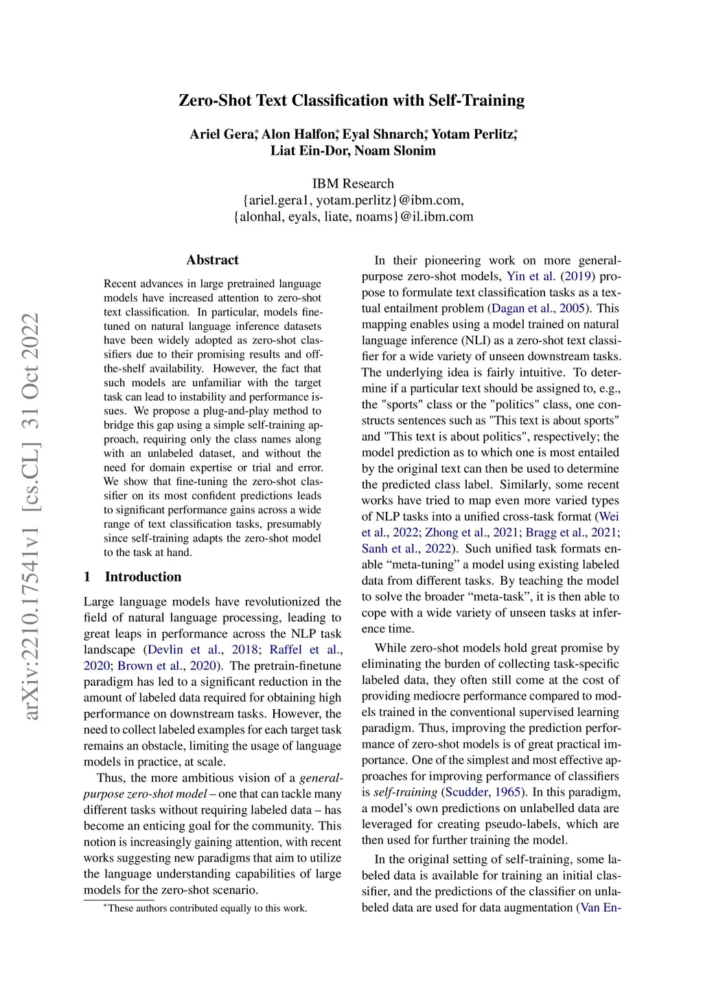 Recent advances in large pretrained language models have increased attention to zero-shot text classification. In particular, models finetuned on natural language inference datasets have been widely adopted as zero-shot classifiers due to their promising results and off-the-shelf availability. However, the fact that such models are unfamiliar with the target task can lead to instability and performance issues. We propose a plug-and-play method to bridge this gap using a simple self-training approach, requiring only the class names along with an unlabeled dataset, and without the need for domain expertise or trial and error. We show that fine-tuning the zero-shot classifier on its most confident predictions leads to significant performance gains across a wide range of text classification tasks, presumably since self-training adapts the zero-shot model to the task at hand.