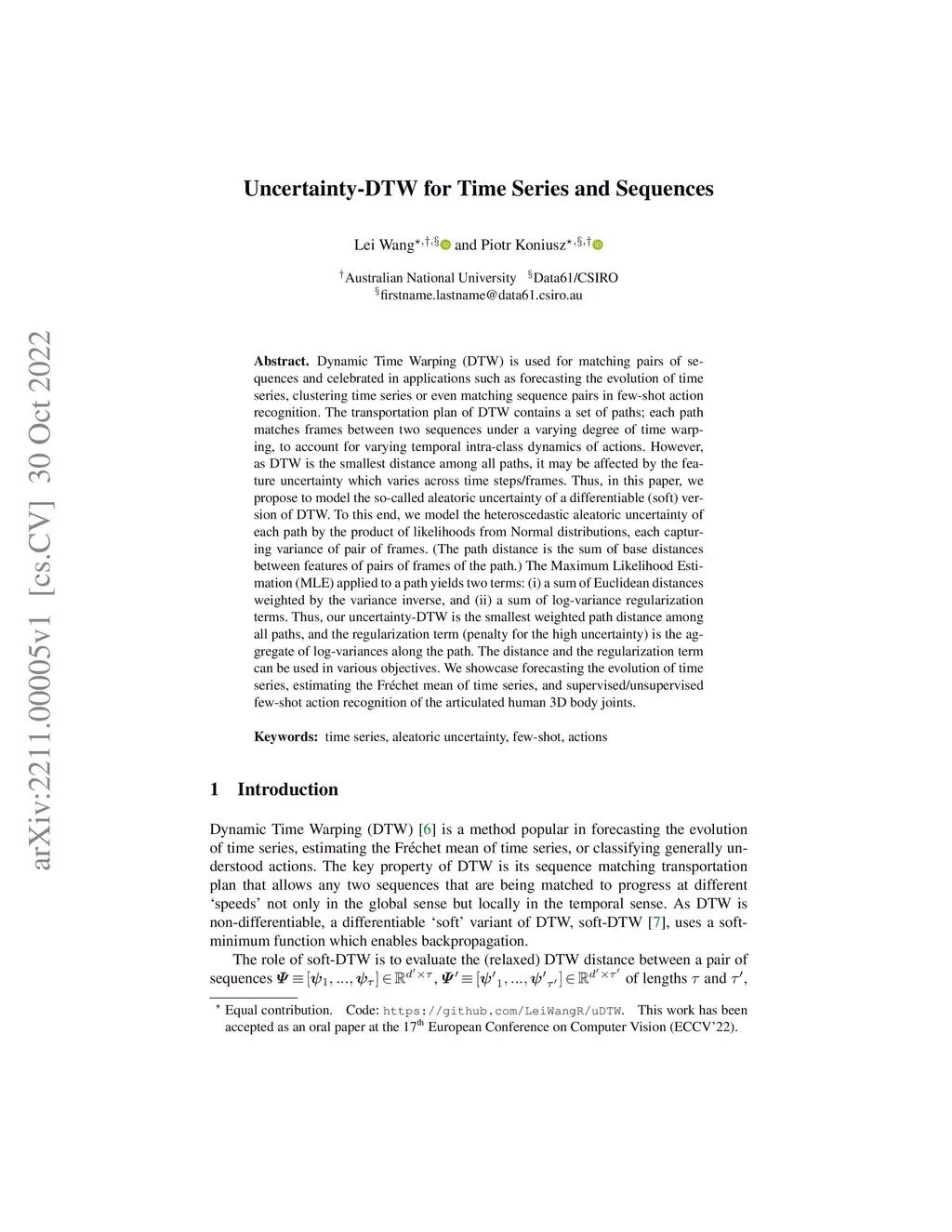 Dynamic Time Warping (DTW) is used for matching pairs of sequences and celebrated in applications such as forecasting the evolution of time series, clustering time series or even matching sequence pairs in few-shot action recognition. The transportation plan of DTW contains a set of paths; each path matches frames between two sequences under a varying degree of time warping, to account for varying temporal intra-class dynamics of actions. However, as DTW is the smallest distance among all paths, it may be affected by the feature uncertainty which varies across time steps/frames. Thus, in this paper, we propose to model the so-called aleatoric uncertainty of a differentiable (soft) version of DTW. To this end, we model the heteroscedastic aleatoric uncertainty of each path by the product of likelihoods from Normal distributions, each capturing variance of pair of frames. (The path distance is the sum of base distances between features of pairs of frames of the path.) The Maximum Likelihood Estimation (MLE) applied to a path yields two terms: (i) a sum of Euclidean distances weighted by the variance inverse, and (ii) a sum of log-variance regularization terms. Thus, our uncertainty-DTW is the smallest weighted path distance among all paths, and the regularization term (penalty for the high uncertainty) is the aggregate of log-variances along the path. The distance and the regularization term can be used in various objectives. We showcase forecasting the evolution of time series, estimating the Fr\échet mean of time series, and supervised/unsupervised few-shot action recognition of the articulated human 3D body joints.