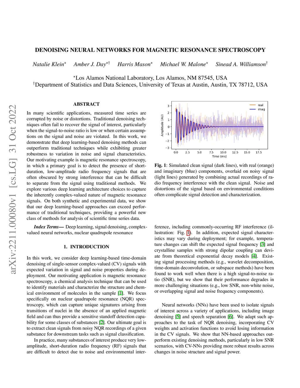 In many scientific applications, measured time series are corrupted by noise or distortions. Traditional denoising techniques often fail to recover the signal of interest, particularly when the signal-to-noise ratio is low or when certain assumptions on the signal and noise are violated. In this work, we demonstrate that deep learning-based denoising methods can outperform traditional techniques while exhibiting greater robustness to variation in noise and signal characteristics. Our motivating example is magnetic resonance spectroscopy, in which a primary goal is to detect the presence of short-duration, low-amplitude radio frequency signals that are often obscured by strong interference that can be difficult to separate from the signal using traditional methods. We explore various deep learning architecture choices to capture the inherently complex-valued nature of magnetic resonance signals. On both synthetic and experimental data, we show that our deep learning-based approaches can exceed performance of traditional techniques, providing a powerful new class of methods for analysis of scientific time series data.