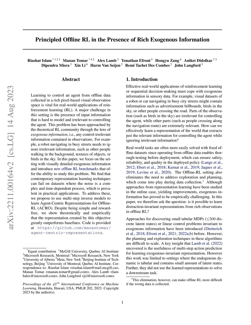 Learning to control an agent from data collected offline in a rich pixel-based visual observation space is vital for real-world applications of reinforcement learning (RL). A major challenge in this setting is the presence of input information that is hard to model and irrelevant to controlling the agent. This problem has been approached by the theoretical RL community through the lens of exogenous information, i.e, any control-irrelevant information contained in observations. For example, a robot navigating in busy streets needs to ignore irrelevant information, such as other people walking in the background, textures of objects, or birds in the sky. In this paper, we focus on the setting with visually detailed exogenous information, and introduce new offline RL benchmarks offering the ability to study this problem. We find that contemporary representation learning techniques can fail on datasets where the noise is a complex and time dependent process, which is prevalent in practical applications. To address these, we propose to use multi-step inverse models, which have seen a great deal of interest in the RL theory community, to learn Agent-Controller Representations for Offline-RL (ACRO). Despite being simple and requiring no reward, we show theoretically and empirically that the representation created by this objective greatly outperforms baselines.