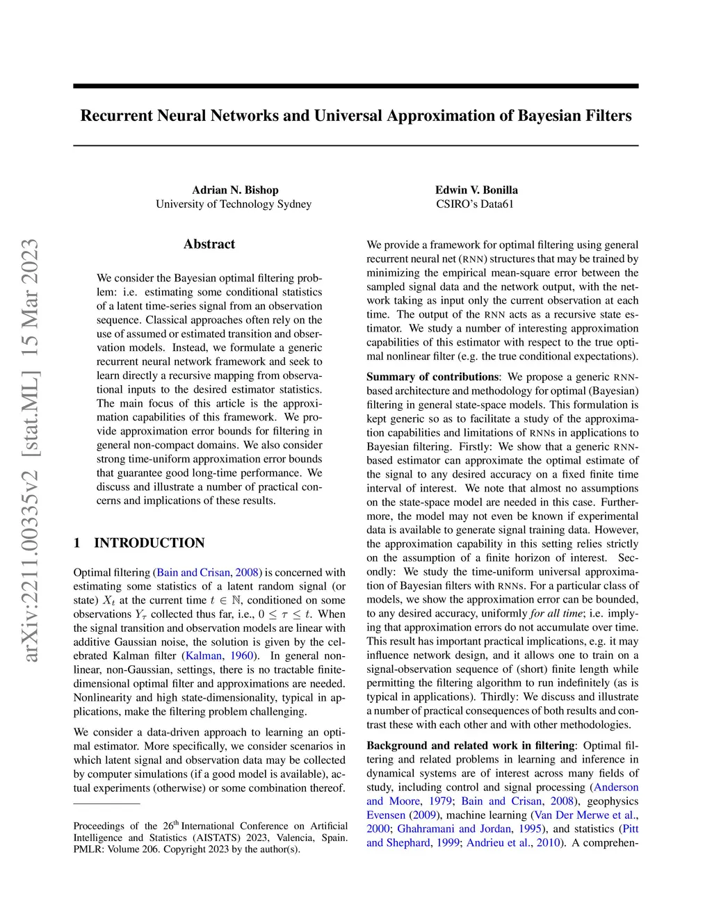 We consider the Bayesian optimal filtering problem: i.e. estimating some conditional statistics of a latent time-series signal from an observation sequence. Classical approaches often rely on the use of assumed or estimated transition and observation models. Instead, we formulate a generic recurrent neural network framework and seek to learn directly a recursive mapping from observational inputs to the desired estimator statistics. The main focus of this article is the approximation capabilities of this framework. We provide approximation error bounds for filtering in general non-compact domains. We also consider strong time-uniform approximation error bounds that guarantee good long-time performance. We discuss and illustrate a number of practical concerns and implications of these results.