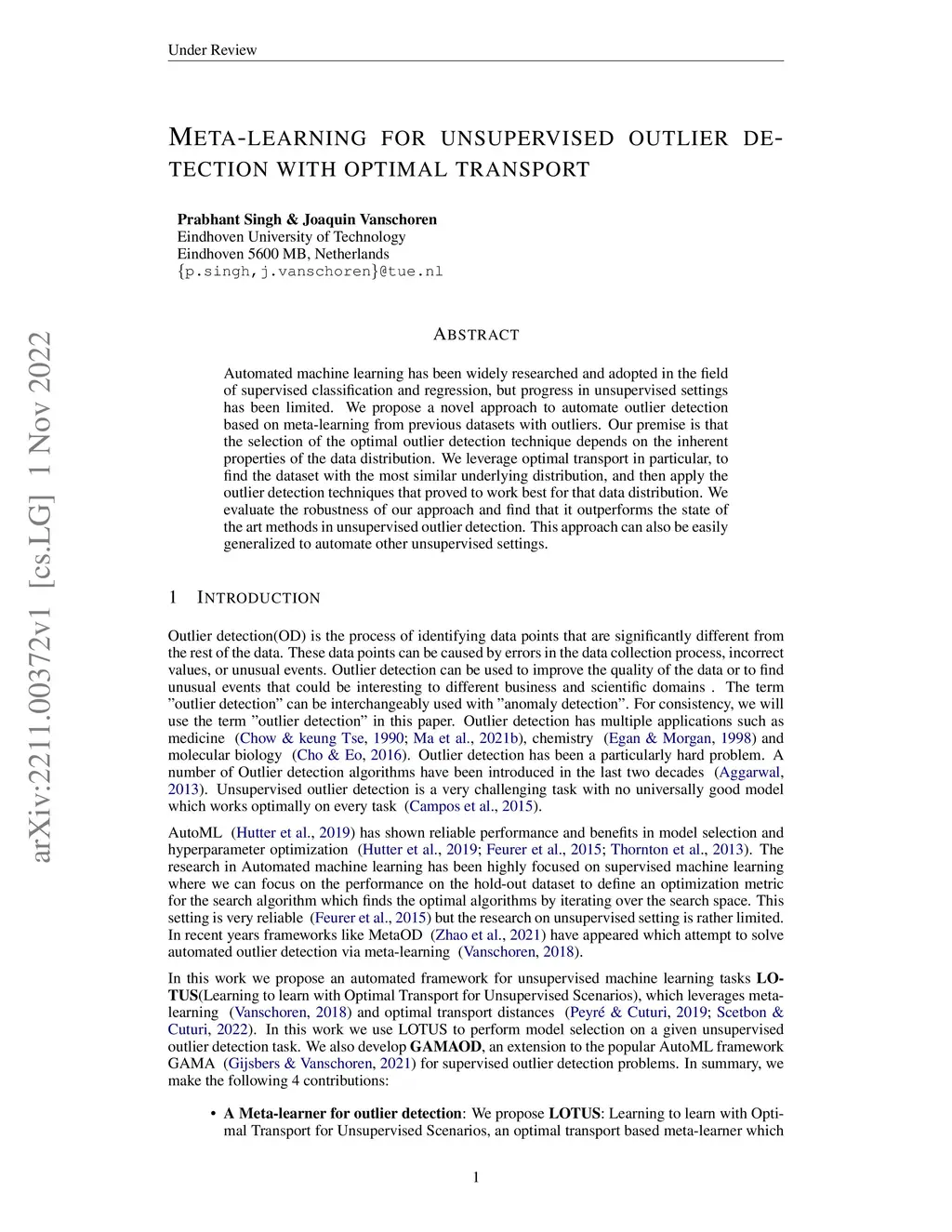 Automated machine learning has been widely researched and adopted in the field of supervised classification and regression, but progress in unsupervised settings has been limited. We propose a novel approach to automate outlier detection based on meta-learning from previous datasets with outliers. Our premise is that the selection of the optimal outlier detection technique depends on the inherent properties of the data distribution. We leverage optimal transport in particular, to find the dataset with the most similar underlying distribution, and then apply the outlier detection techniques that proved to work best for that data distribution. We evaluate the robustness of our approach and find that it outperforms the state of the art methods in unsupervised outlier detection. This approach can also be easily generalized to automate other unsupervised settings.