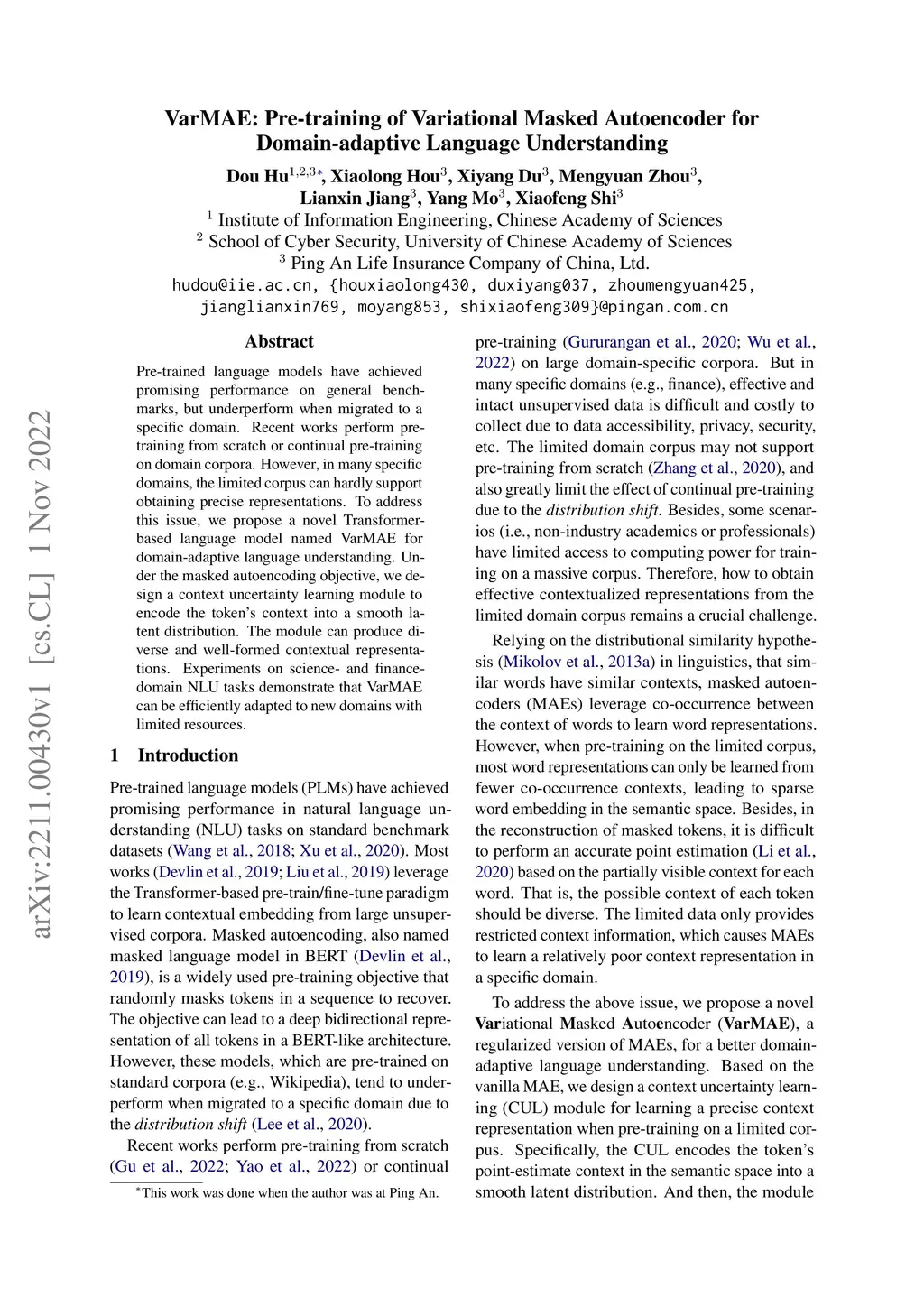 Pre-trained language models have achieved promising performance on general benchmarks, but underperform when migrated to a specific domain. Recent works perform pre-training from scratch or continual pre-training on domain corpora. However, in many specific domains, the limited corpus can hardly support obtaining precise representations. To address this issue, we propose a novel Transformer-based language model named VarMAE for domain-adaptive language understanding. Under the masked autoencoding objective, we design a context uncertainty learning module to encode the token's context into a smooth latent distribution. The module can produce diverse and well-formed contextual representations. Experiments on science- and finance-domain NLU tasks demonstrate that VarMAE can be efficiently adapted to new domains with limited resources.