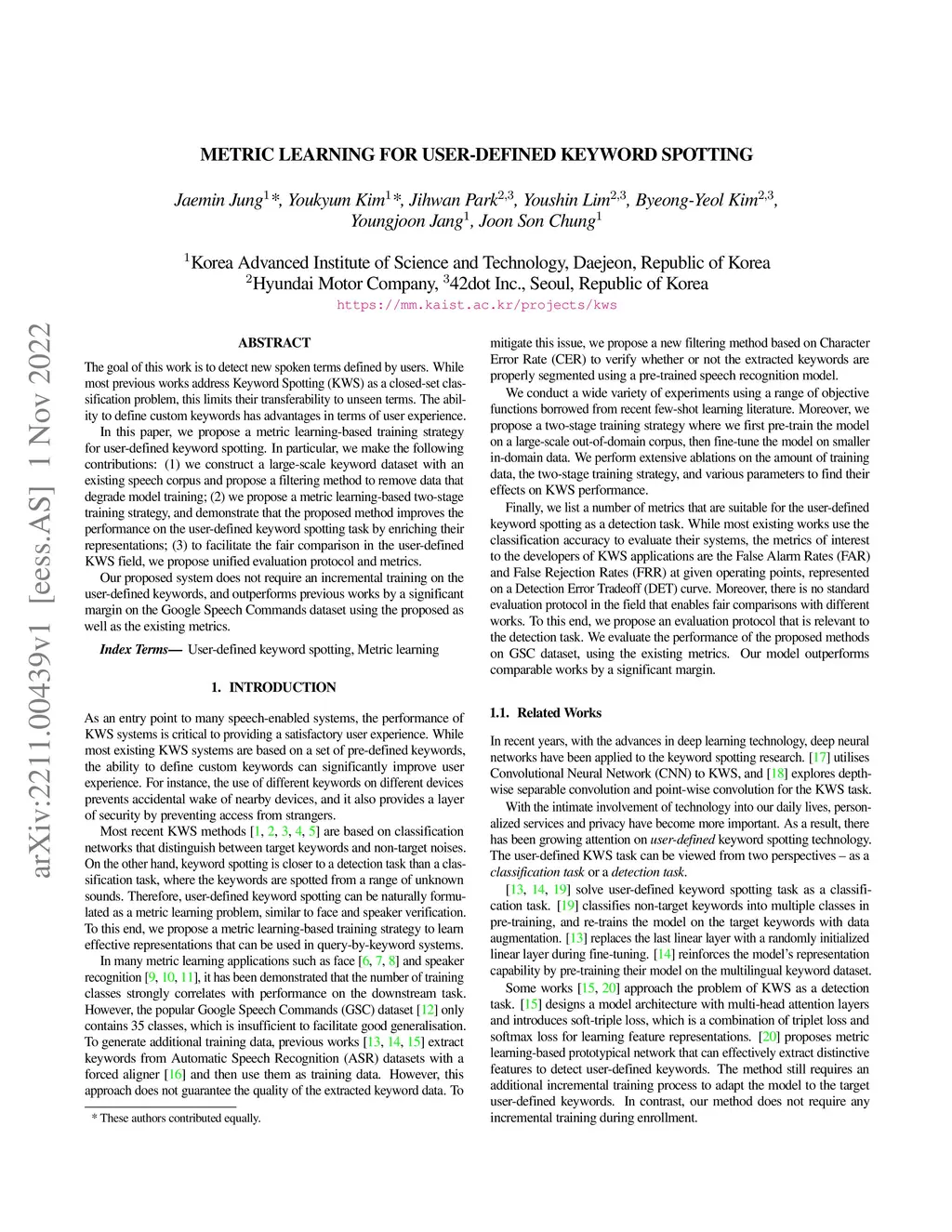 The goal of this work is to detect new spoken terms defined by users. While most previous works address Keyword Spotting (KWS) as a closed-set classification problem, this limits their transferability to unseen terms. The ability to define custom keywords has advantages in terms of user experience. In this paper, we propose a metric learning-based training strategy for user-defined keyword spotting. In particular, we make the following contributions: (1) we construct a large-scale keyword dataset with an existing speech corpus and propose a filtering method to remove data that degrade model training; (2) we propose a metric learning-based two-stage training strategy, and demonstrate that the proposed method improves the performance on the user-defined keyword spotting task by enriching their representations; (3) to facilitate the fair comparison in the user-defined KWS field, we propose unified evaluation protocol and metrics. Our proposed system does not require an incremental training on the user-defined keywords, and outperforms previous works by a significant margin on the Google Speech Commands dataset using the proposed as well as the existing metrics.