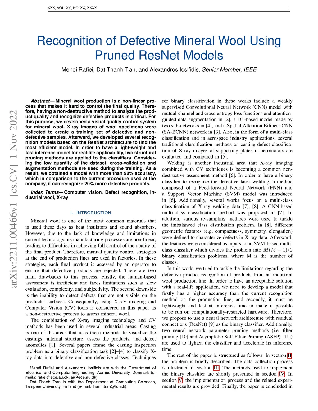 Mineral wool production is a non-linear process that makes it hard to control the final quality. Therefore, having a non-destructive method to analyze the product quality and recognize defective products is critical. For this purpose, we developed a visual quality control system for mineral wool. X-ray images of wool specimens were collected to create a training set of defective and non-defective samples. Afterward, we developed several recognition models based on the ResNet architecture to find the most efficient model. In order to have a light-weight and fast inference model for real-life applicability, two structural pruning methods are applied to the classifiers. Considering the low quantity of the dataset, cross-validation and augmentation methods are used during the training. As a result, we obtained a model with more than 98% accuracy, which in comparison to the current procedure used at the company, it can recognize 20% more defective products.