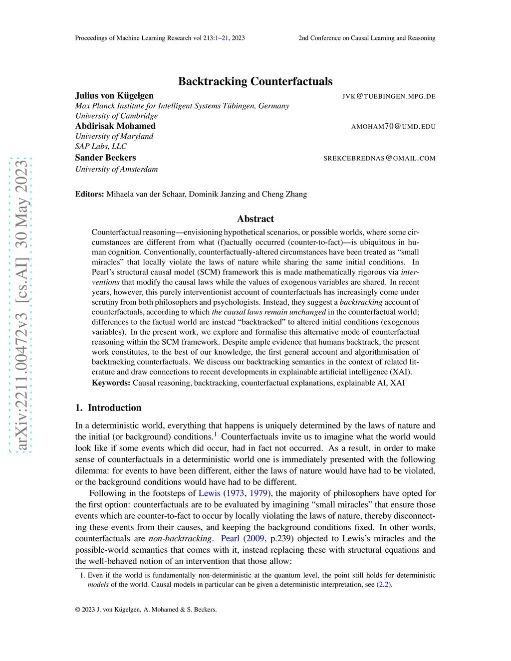 Counterfactual reasoning -- envisioning hypothetical scenarios, or possible worlds, where some circumstances are different from what (f)actually occurred (counter-to-fact) -- is ubiquitous in human cognition. Conventionally, counterfactually-altered circumstances have been treated as "small miracles" that locally violate the laws of nature while sharing the same initial conditions. In Pearl's structural causal model (SCM) framework this is made mathematically rigorous via interventions that modify the causal laws while the values of exogenous variables are shared. In recent years, however, this purely interventionist account of counterfactuals has increasingly come under scrutiny from both philosophers and psychologists. Instead, they suggest a backtracking account of counterfactuals, according to which the causal laws remain unchanged in the counterfactual world; differences to the factual world are instead "backtracked" to altered initial conditions (exogenous variables). In the present work, we explore and formalise this alternative mode of counterfactual reasoning within the SCM framework. Despite ample evidence that humans backtrack, the present work constitutes, to the best of our knowledge, the first general account and algorithmisation of backtracking counterfactuals. We discuss our backtracking semantics in the context of related literature and draw connections to recent developments in explainable artificial intelligence (XAI).