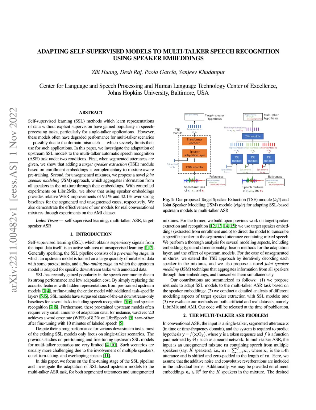 Self-supervised learning (SSL) methods which learn representations of data without explicit supervision have gained popularity in speech-processing tasks, particularly for single-talker applications. However, these models often have degraded performance for multi-talker scenarios -- possibly due to the domain mismatch -- which severely limits their use for such applications. In this paper, we investigate the adaptation of upstream SSL models to the multi-talker automatic speech recognition (ASR) task under two conditions. First, when segmented utterances are given, we show that adding a target speaker extraction (TSE) module based on enrollment embeddings is complementary to mixture-aware pre-training. Second, for unsegmented mixtures, we propose a novel joint speaker modeling (JSM) approach, which aggregates information from all speakers in the mixture through their embeddings. With controlled experiments on Libri2Mix, we show that using speaker embeddings provides relative WER improvements of 9.1% and 42.1% over strong baselines for the segmented and unsegmented cases, respectively. We also demonstrate the effectiveness of our models for real conversational mixtures through experiments on the AMI dataset.