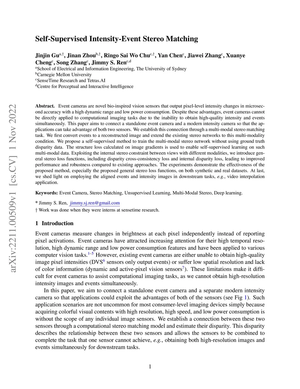 Event cameras are novel bio-inspired vision sensors that output pixel-level intensity changes in microsecond accuracy with a high dynamic range and low power consumption. Despite these advantages, event cameras cannot be directly applied to computational imaging tasks due to the inability to obtain high-quality intensity and events simultaneously. This paper aims to connect a standalone event camera and a modern intensity camera so that the applications can take advantage of both two sensors. We establish this connection through a multi-modal stereo matching task. We first convert events to a reconstructed image and extend the existing stereo networks to this multi-modality condition. We propose a self-supervised method to train the multi-modal stereo network without using ground truth disparity data. The structure loss calculated on image gradients is used to enable self-supervised learning on such multi-modal data. Exploiting the internal stereo constraint between views with different modalities, we introduce general stereo loss functions, including disparity cross-consistency loss and internal disparity loss, leading to improved performance and robustness compared to existing approaches. The experiments demonstrate the effectiveness of the proposed method, especially the proposed general stereo loss functions, on both synthetic and real datasets. At last, we shed light on employing the aligned events and intensity images in downstream tasks, e.g., video interpolation application.