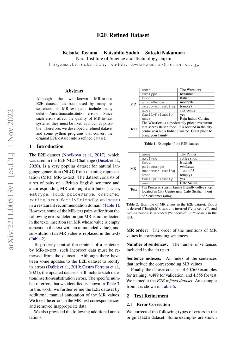 Although the well-known MR-to-text E2E dataset has been used by many researchers, its MR-text pairs include many deletion/insertion/substitution errors. Since such errors affect the quality of MR-to-text systems, they must be fixed as much as possible. Therefore, we developed a refined dataset and some python programs that convert the original E2E dataset into a refined dataset.