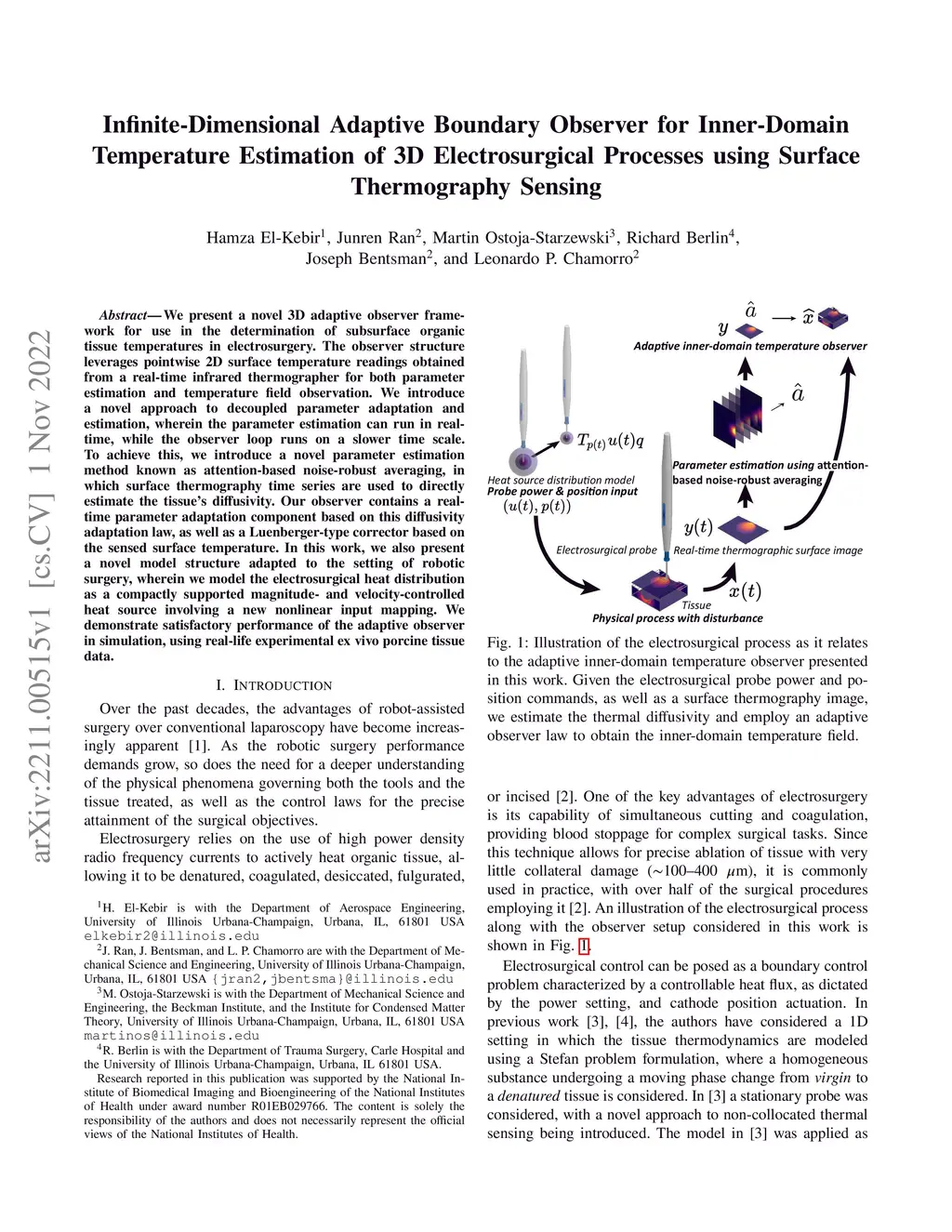 We present a novel 3D adaptive observer framework for use in the determination of subsurface organic tissue temperatures in electrosurgery. The observer structure leverages pointwise 2D surface temperature readings obtained from a real-time infrared thermographer for both parameter estimation and temperature field observation. We introduce a novel approach to decoupled parameter adaptation and estimation, wherein the parameter estimation can run in real-time, while the observer loop runs on a slower time scale. To achieve this, we introduce a novel parameter estimation method known as attention-based noise-robust averaging, in which surface thermography time series are used to directly estimate the tissue's diffusivity. Our observer contains a real-time parameter adaptation component based on this diffusivity adaptation law, as well as a Luenberger-type corrector based on the sensed surface temperature. In this work, we also present a novel model structure adapted to the setting of robotic surgery, wherein we model the electrosurgical heat distribution as a compactly supported magnitude- and velocity-controlled heat source involving a new nonlinear input mapping. We demonstrate satisfactory performance of the adaptive observer in simulation, using real-life experimental ex vivo porcine tissue data.