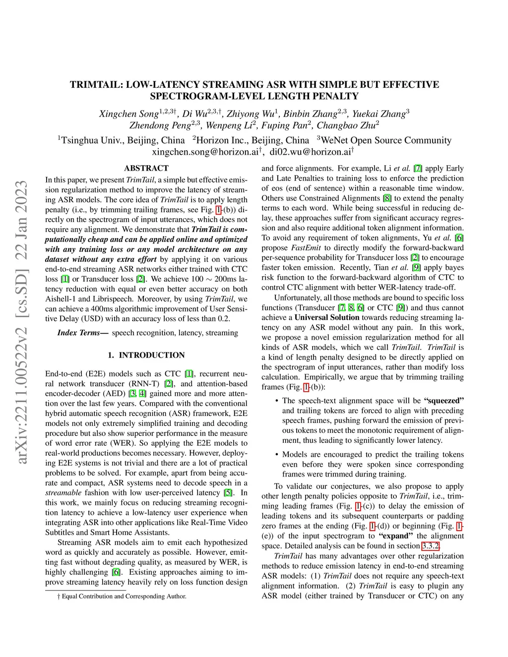 In this paper, we present TrimTail, a simple but effective emission regularization method to improve the latency of streaming ASR models. The core idea of TrimTail is to apply length penalty (i.e., by trimming trailing frames, see Fig. 1-(b)) directly on the spectrogram of input utterances, which does not require any alignment. We demonstrate that TrimTail is computationally cheap and can be applied online and optimized with any training loss or any model architecture on any dataset without any extra effort by applying it on various end-to-end streaming ASR networks either trained with CTC loss [1] or Transducer loss [2]. We achieve 100 200ms latency reduction with equal or even better accuracy on both Aishell-1 and Librispeech. Moreover, by using TrimTail, we can achieve a 400ms algorithmic improvement of User Sensitive Delay (USD) with an accuracy loss of less than 0.2.