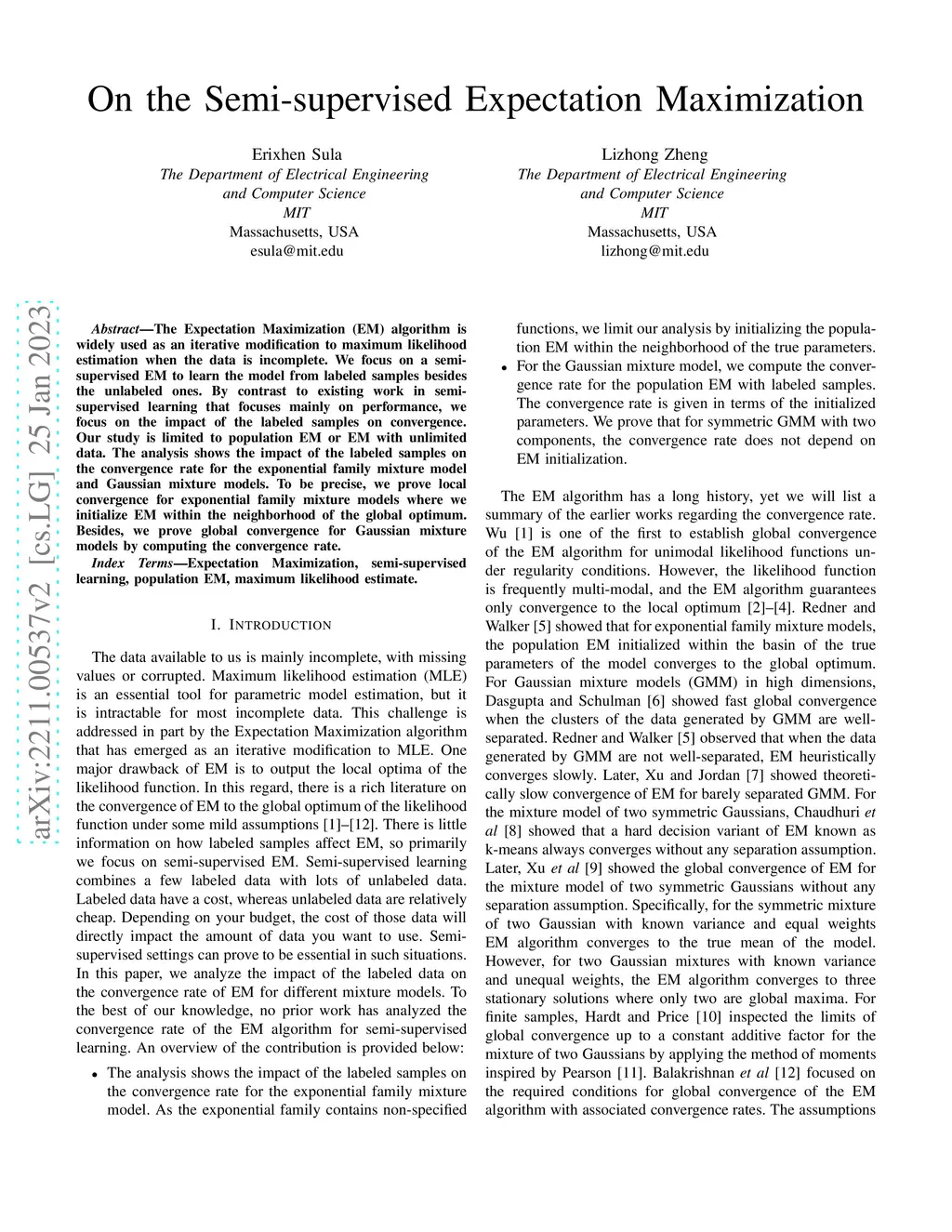 The Expectation Maximization (EM) algorithm is widely used as an iterative modification to maximum likelihood estimation when the data is incomplete. We focus on a semi-supervised case to learn the model from labeled and unlabeled samples. Existing work in the semi-supervised case has focused mainly on performance rather than convergence guarantee, however we focus on the contribution of the labeled samples to the convergence rate. The analysis clearly demonstrates how the labeled samples improve the convergence rate for the exponential family mixture model. In this case, we assume that the population EM (EM with unlimited data) is initialized within the neighborhood of global convergence for the population EM that consists solely of samples that have not been labeled. The analysis for the labeled samples provides a comprehensive description of the convergence rate for the Gaussian mixture model. In addition, we extend the findings for labeled samples and offer an alternative proof for the population EM's convergence rate with unlabeled samples for the symmetric mixture of two Gaussians.
