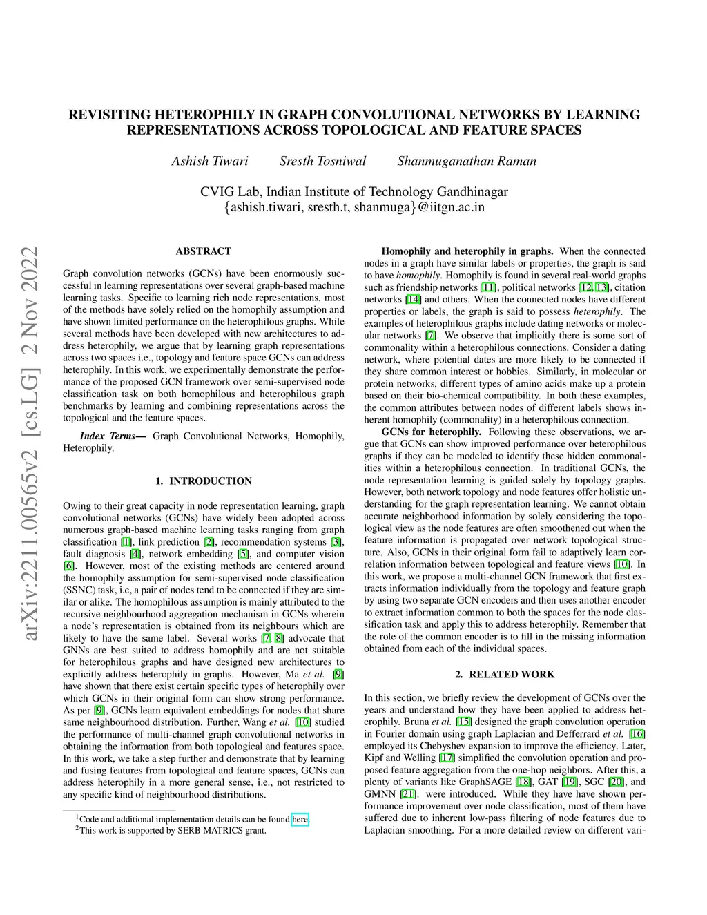 Graph convolution networks (GCNs) have been enormously successful in learning representations over several graph-based machine learning tasks. Specific to learning rich node representations, most of the methods have solely relied on the homophily assumption and have shown limited performance on the heterophilous graphs. While several methods have been developed with new architectures to address heterophily, we argue that by learning graph representations across two spaces i.e., topology and feature space GCNs can address heterophily. In this work, we experimentally demonstrate the performance of the proposed GCN framework over semi-supervised node classification task on both homophilous and heterophilous graph benchmarks by learning and combining representations across the topological and the feature spaces.