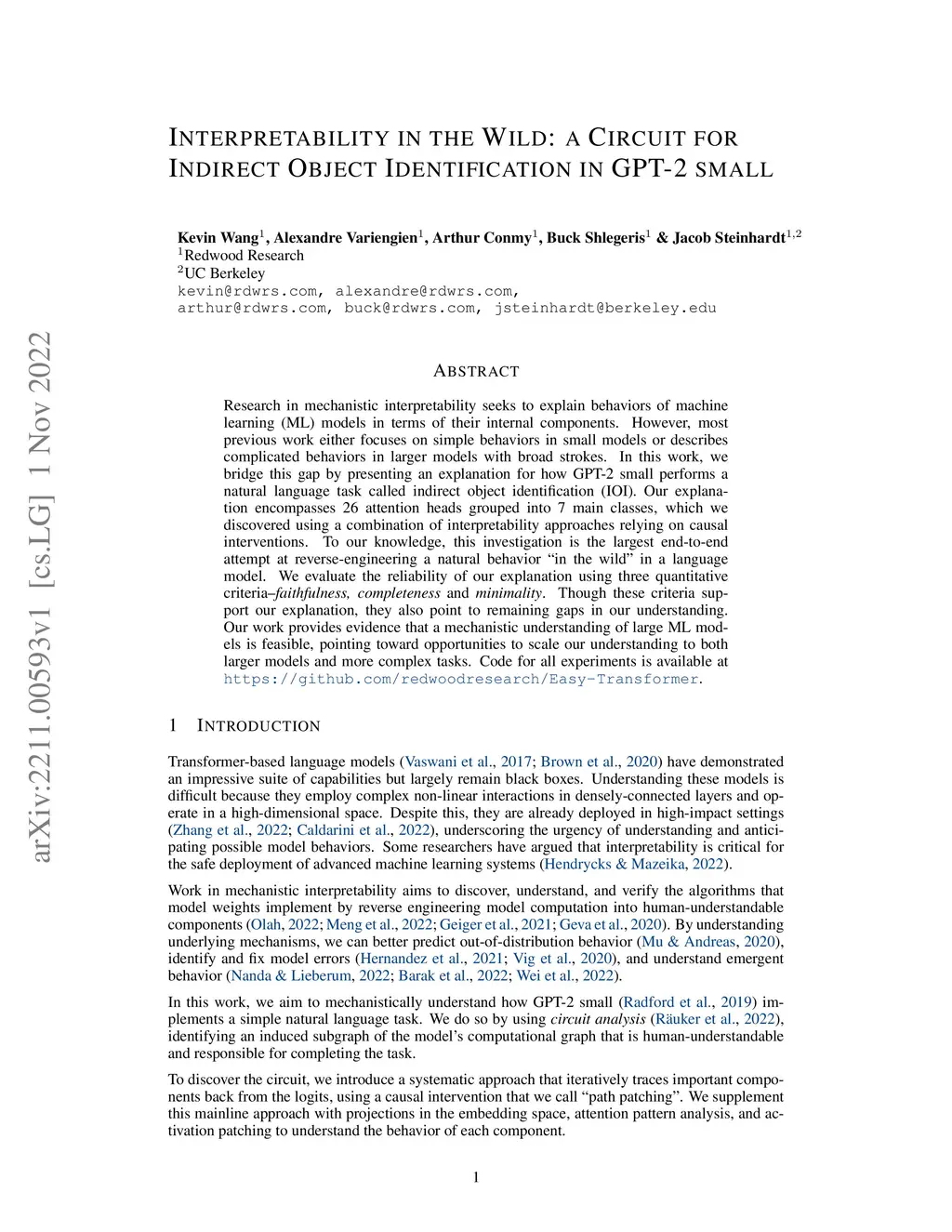 Interpretability in the Wild: a Circuit for Indirect Object