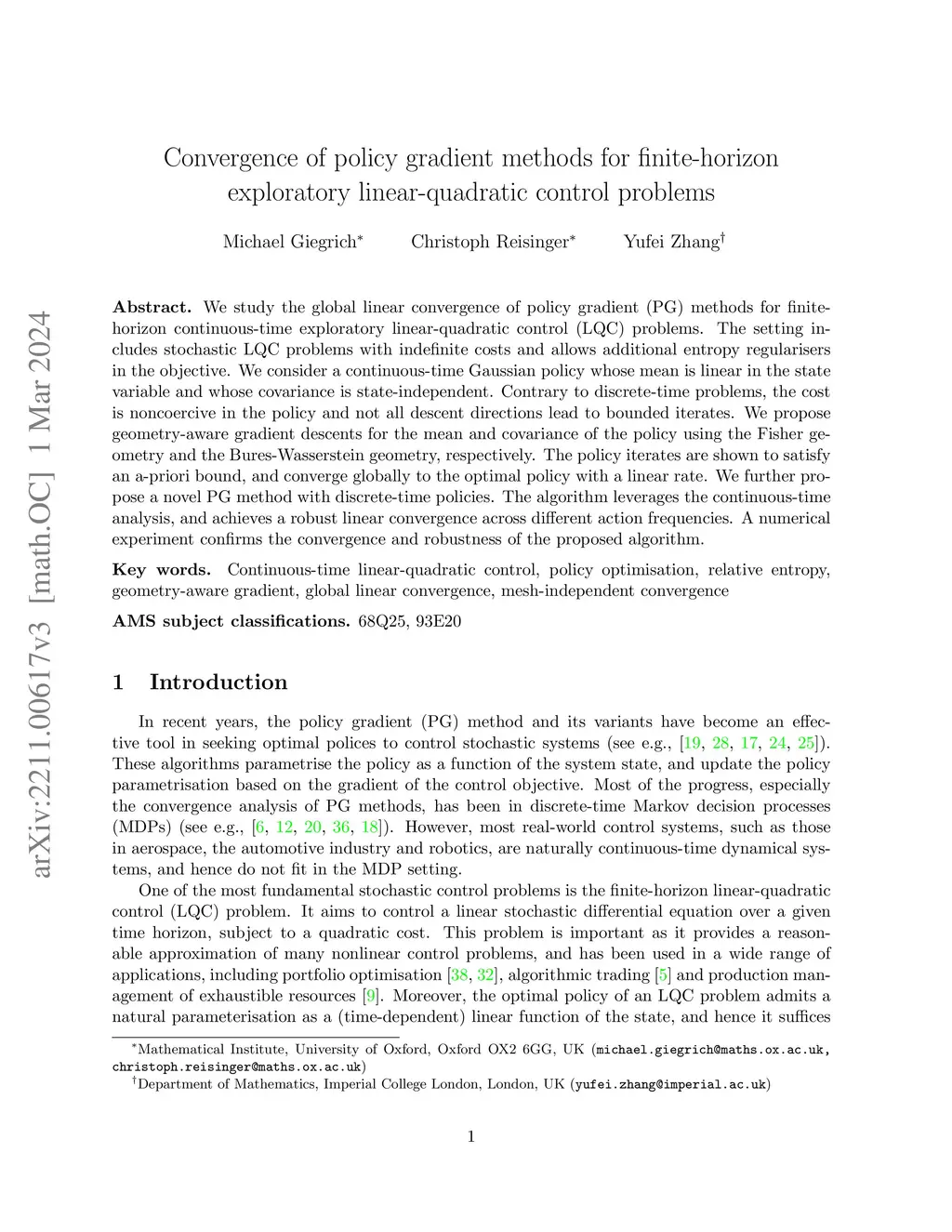 We study the global linear convergence of policy gradient (PG) methods for finite-horizon continuous-time exploratory linear-quadratic control (LQC) problems. The setting includes stochastic LQC problems with indefinite costs and allows additional entropy regularisers in the objective. We consider a continuous-time Gaussian policy whose mean is linear in the state variable and whose covariance is state-independent. Contrary to discrete-time problems, the cost is noncoercive in the policy and not all descent directions lead to bounded iterates. We propose geometry-aware gradient descents for the mean and covariance of the policy using the Fisher geometry and the Bures-Wasserstein geometry, respectively. The policy iterates are shown to satisfy an a-priori bound, and converge globally to the optimal policy with a linear rate. We further propose a novel PG method with discrete-time policies. The algorithm leverages the continuous-time analysis, and achieves a robust linear convergence across different action frequencies. A numerical experiment confirms the convergence and robustness of the proposed algorithm.