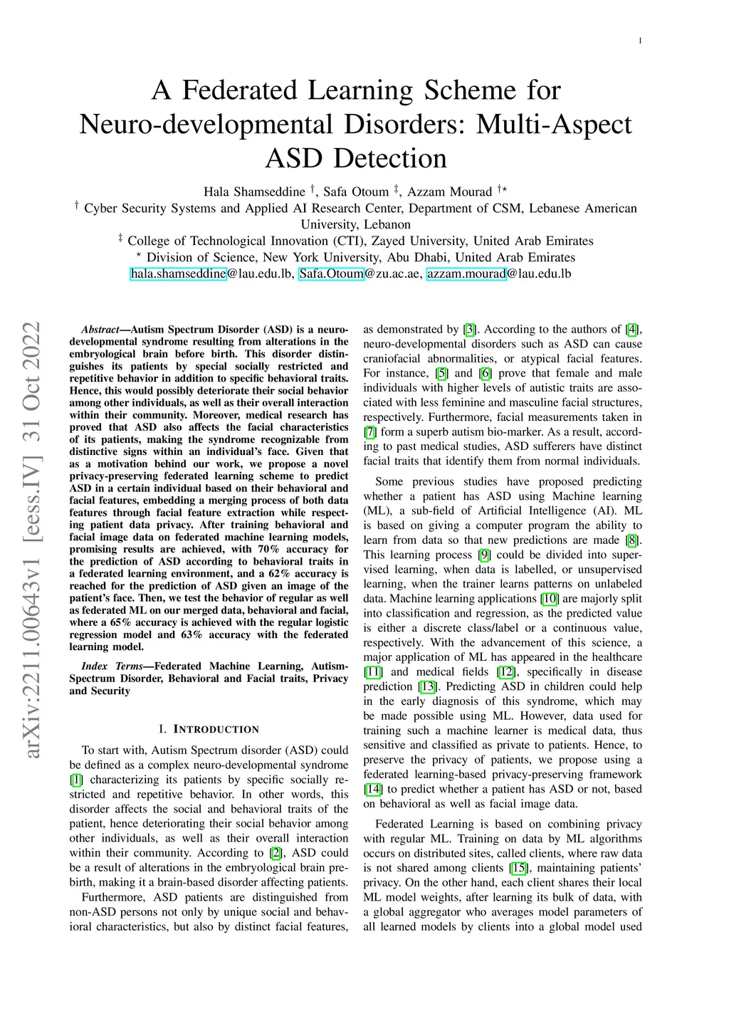 Autism Spectrum Disorder (ASD) is a neuro-developmental syndrome resulting from alterations in the embryological brain before birth. This disorder distinguishes its patients by special socially restricted and repetitive behavior in addition to specific behavioral traits. Hence, this would possibly deteriorate their social behavior among other individuals, as well as their overall interaction within their community. Moreover, medical research has proved that ASD also affects the facial characteristics of its patients, making the syndrome recognizable from distinctive signs within an individual's face. Given that as a motivation behind our work, we propose a novel privacy-preserving federated learning scheme to predict ASD in a certain individual based on their behavioral and facial features, embedding a merging process of both data features through facial feature extraction while respecting patient data privacy. After training behavioral and facial image data on federated machine learning models, promising results are achieved, with 70\% accuracy for the prediction of ASD according to behavioral traits in a federated learning environment, and a 62\% accuracy is reached for the prediction of ASD given an image of the patient's face. Then, we test the behavior of regular as well as federated ML on our merged data, behavioral and facial, where a 65\% accuracy is achieved with the regular logistic regression model and 63\% accuracy with the federated learning model.
