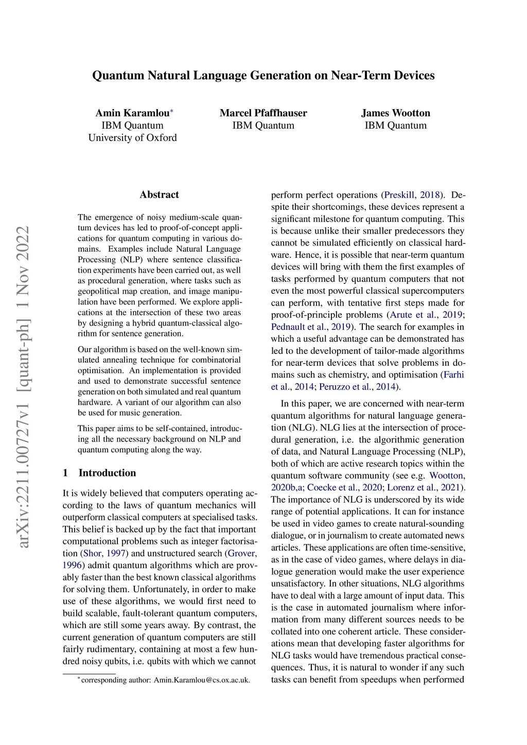 The emergence of noisy medium-scale quantum devices has led to proof-of-concept applications for quantum computing in various domains. Examples include Natural Language Processing (NLP) where sentence classification experiments have been carried out, as well as procedural generation, where tasks such as geopolitical map creation, and image manipulation have been performed. We explore applications at the intersection of these two areas by designing a hybrid quantum-classical algorithm for sentence generation. Our algorithm is based on the well-known simulated annealing technique for combinatorial optimisation. An implementation is provided and used to demonstrate successful sentence generation on both simulated and real quantum hardware. A variant of our algorithm can also be used for music generation. This paper aims to be self-contained, introducing all the necessary background on NLP and quantum computing along the way.
