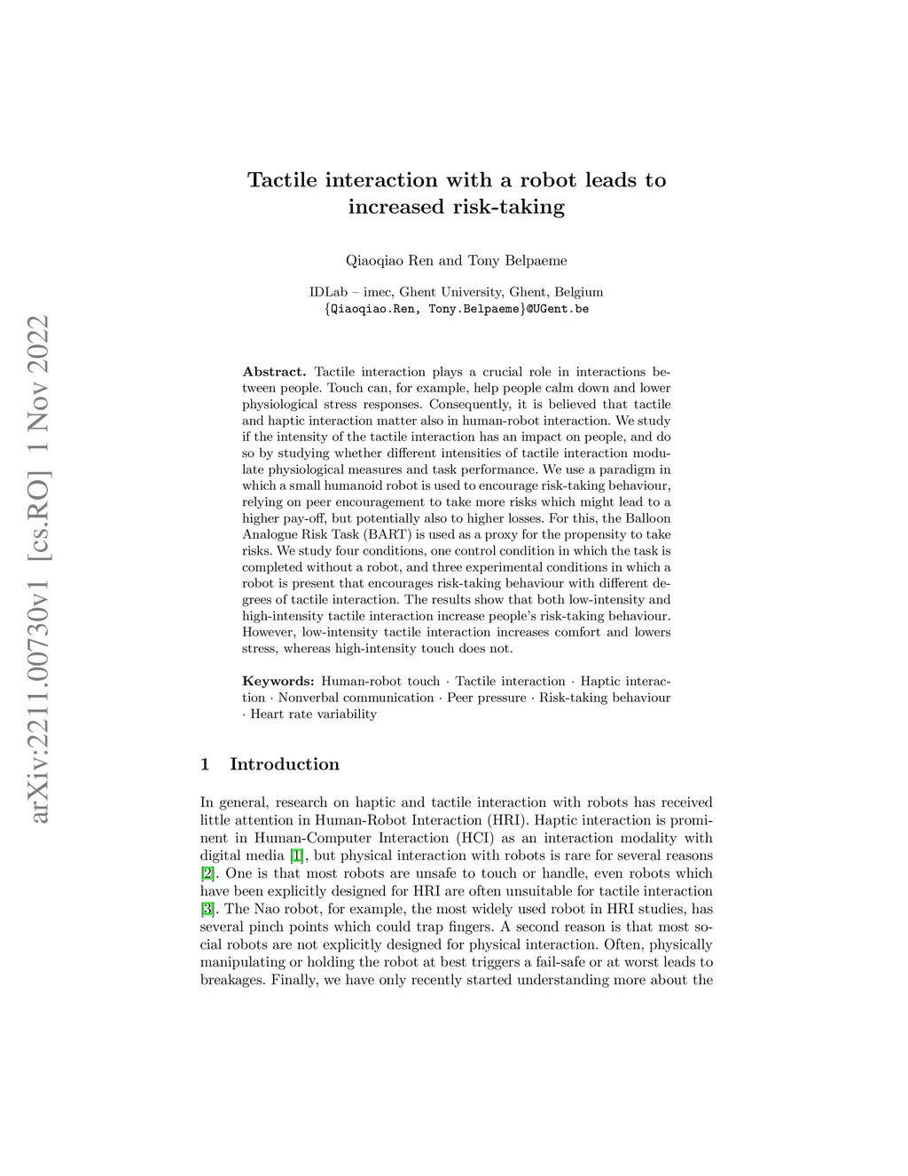 Tactile interaction plays a crucial role in interactions between people. Touch can, for example, help people calm down and lower physiological stress responses. Consequently, it is believed that tactile and haptic interaction matter also in human-robot interaction. We study if the intensity of the tactile interaction has an impact on people, and do so by studying whether different intensities of tactile interaction modulate physiological measures and task performance. We use a paradigm in which a small humanoid robot is used to encourage risk-taking behaviour, relying on peer encouragement to take more risks which might lead to a higher pay-off, but potentially also to higher losses. For this, the Balloon Analogue Risk Task (BART) is used as a proxy for the propensity to take risks. We study four conditions, one control condition in which the task is completed without a robot, and three experimental conditions in which a robot is present that encourages risk-taking behaviour with different degrees of tactile interaction. The results show that both low-intensity and high-intensity tactile interaction increase people's risk-taking behaviour. However, low-intensity tactile interaction increases comfort and lowers stress, whereas high-intensity touch does not.