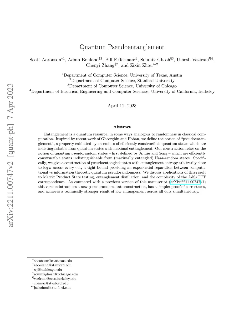 Entanglement is a quantum resource, in some ways analogous to randomness in classical computation. Inspired by recent work of Gheorghiu and Hoban, we define the notion of "pseudoentanglement'', a property exhibited by ensembles of efficiently constructible quantum states which are indistinguishable from quantum states with maximal entanglement. Our construction relies on the notion of quantum pseudorandom states -- first defined by Ji, Liu and Song -- which are efficiently constructible states indistinguishable from (maximally entangled) Haar-random states. Specifically, we give a construction of pseudoentangled states with entanglement entropy arbitrarily close to across every cut, a tight bound providing an exponential separation between computational vs information theoretic quantum pseudorandomness. We discuss applications of this result to Matrix Product State testing, entanglement distillation, and the complexity of the AdS/CFT correspondence. As compared with a previous version of this manuscript (arXiv:2211.00747v1) this version introduces a new pseudorandom state construction, has a simpler proof of correctness, and achieves a technically stronger result of low entanglement across all cuts simultaneously.