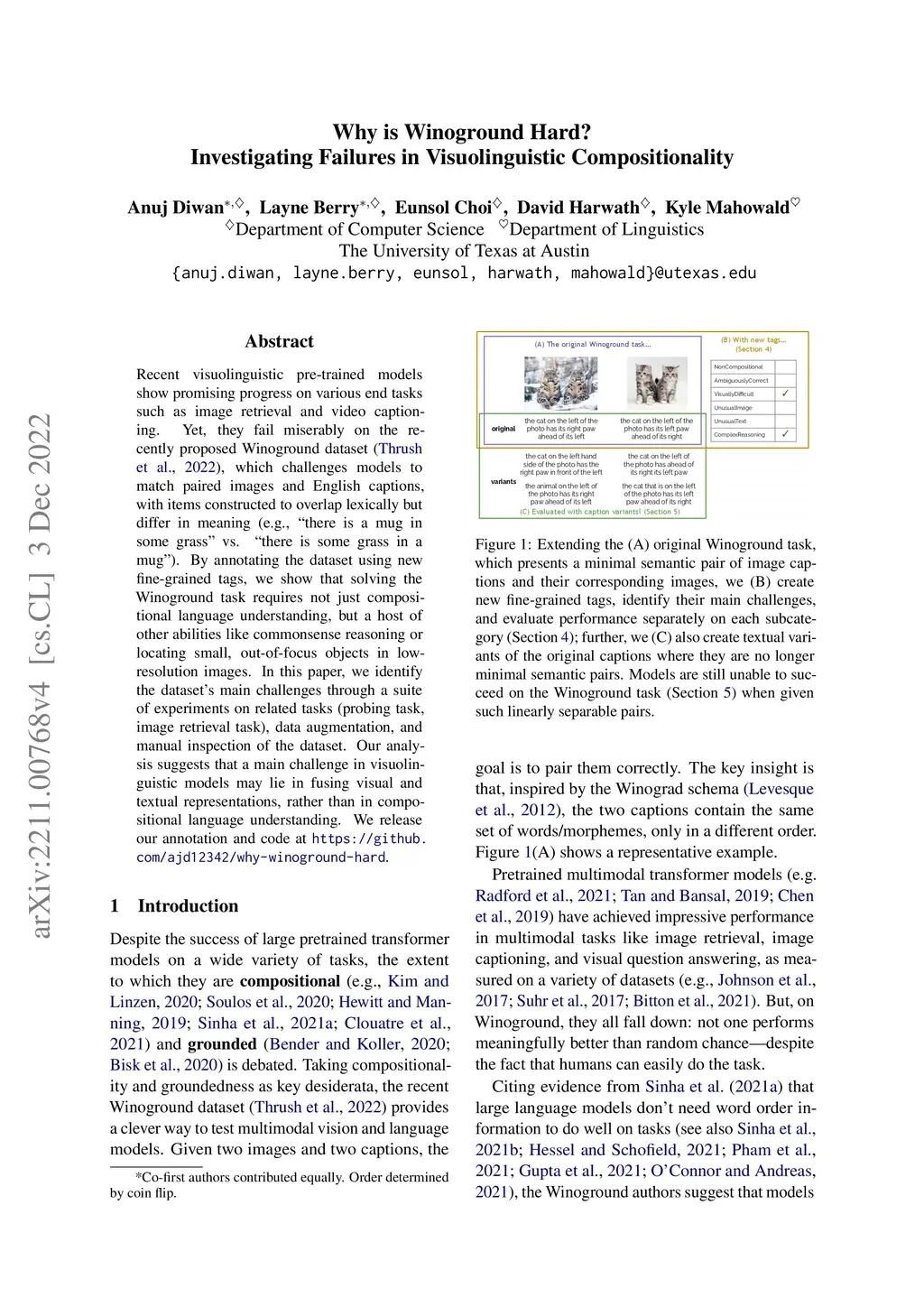 Recent visuolinguistic pre-trained models show promising progress on various end tasks such as image retrieval and video captioning. Yet, they fail miserably on the recently proposed Winoground dataset, which challenges models to match paired images and English captions, with items constructed to overlap lexically but differ in meaning (e.g., "there is a mug in some grass" vs. "there is some grass in a mug"). By annotating the dataset using new fine-grained tags, we show that solving the Winoground task requires not just compositional language understanding, but a host of other abilities like commonsense reasoning or locating small, out-of-focus objects in low-resolution images. In this paper, we identify the dataset's main challenges through a suite of experiments on related tasks (probing task, image retrieval task), data augmentation, and manual inspection of the dataset. Our analysis suggests that a main challenge in visuolinguistic models may lie in fusing visual and textual representations, rather than in compositional language understanding. We release our annotation and code at https://github.com/ajd12342/why-winoground-hard .