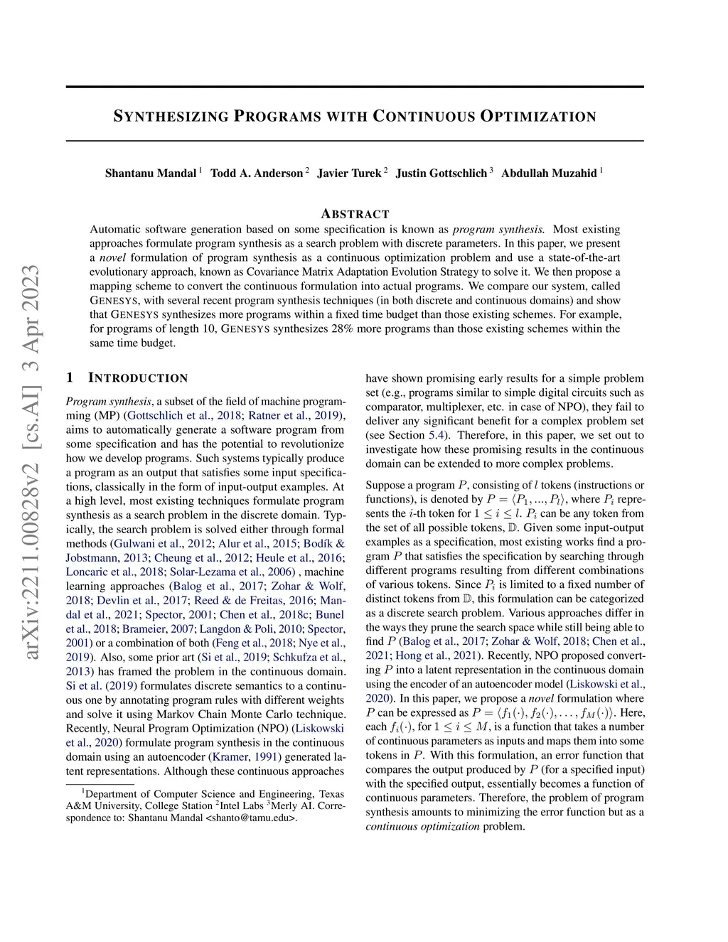 Automatic software generation based on some specification is known as program synthesis. Most existing approaches formulate program synthesis as a search problem with discrete parameters. In this paper, we present a novel formulation of program synthesis as a continuous optimization problem and use a state-of-the-art evolutionary approach, known as Covariance Matrix Adaptation Evolution Strategy to solve the problem. We then propose a mapping scheme to convert the continuous formulation into actual programs. We compare our system, called GENESYS, with several recent program synthesis techniques (in both discrete and continuous domains) and show that GENESYS synthesizes more programs within a fixed time budget than those existing schemes. For example, for programs of length 10, GENESYS synthesizes 28% more programs than those existing schemes within the same time budget.
