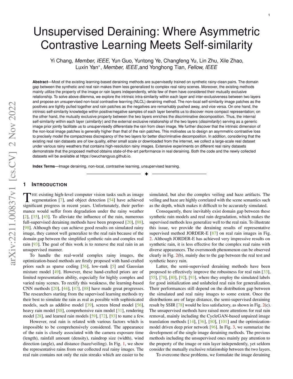 Most of the existing learning-based deraining methods are supervisedly trained on synthetic rainy-clean pairs. The domain gap between the synthetic and real rain makes them less generalized to complex real rainy scenes. Moreover, the existing methods mainly utilize the property of the image or rain layers independently, while few of them have considered their mutually exclusive relationship. To solve above dilemma, we explore the intrinsic intra-similarity within each layer and inter-exclusiveness between two layers and propose an unsupervised non-local contrastive learning (NLCL) deraining method. The non-local self-similarity image patches as the positives are tightly pulled together, rain patches as the negatives are remarkably pushed away, and vice versa. On one hand, the intrinsic self-similarity knowledge within positive/negative samples of each layer benefits us to discover more compact representation; on the other hand, the mutually exclusive property between the two layers enriches the discriminative decomposition. Thus, the internal self-similarity within each layer (similarity) and the external exclusive relationship of the two layers (dissimilarity) serving as a generic image prior jointly facilitate us to unsupervisedly differentiate the rain from clean image. We further discover that the intrinsic dimension of the non-local image patches is generally higher than that of the rain patches. This motivates us to design an asymmetric contrastive loss to precisely model the compactness discrepancy of the two layers for better discriminative decomposition. In addition, considering that the existing real rain datasets are of low quality, either small scale or downloaded from the internet, we collect a real large-scale dataset under various rainy kinds of weather that contains high-resolution rainy images.