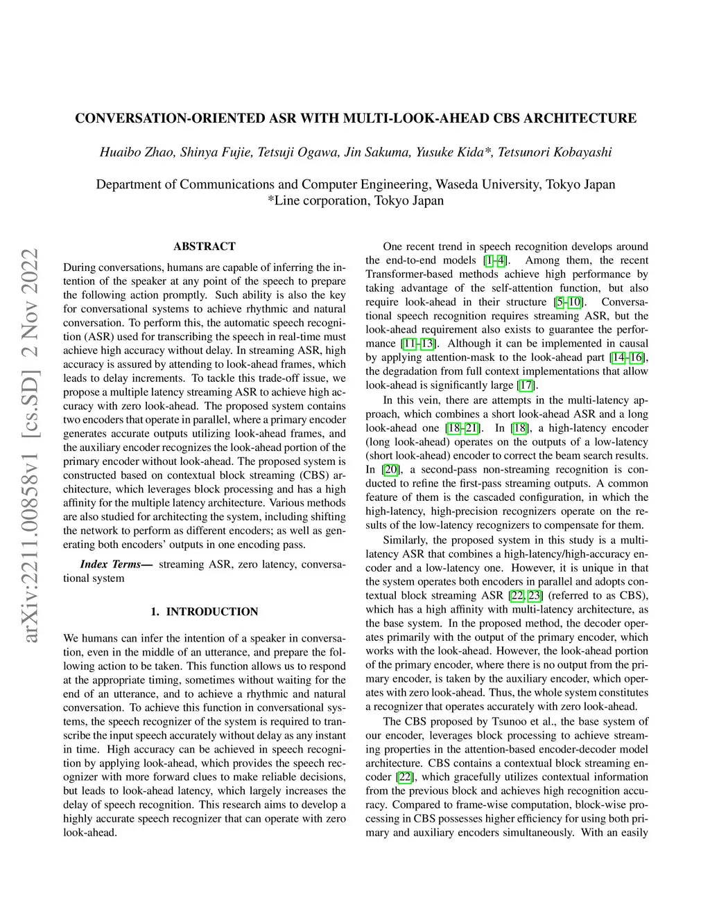 Conversation-oriented ASR with multi-look-ahead CBS architecture