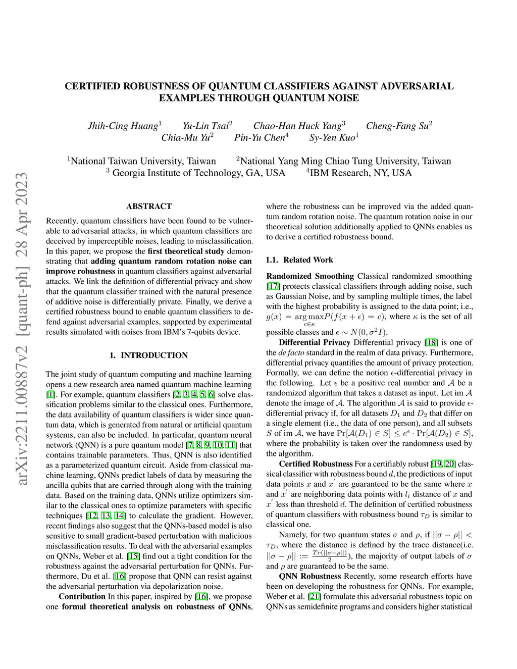 Recently, quantum classifiers have been found to be vulnerable to adversarial attacks, in which quantum classifiers are deceived by imperceptible noises, leading to misclassification. In this paper, we propose the first theoretical study demonstrating that adding quantum random rotation noise can improve robustness in quantum classifiers against adversarial attacks. We link the definition of differential privacy and show that the quantum classifier trained with the natural presence of additive noise is differentially private. Finally, we derive a certified robustness bound to enable quantum classifiers to defend against adversarial examples, supported by experimental results simulated with noises from IBM's 7-qubits device.