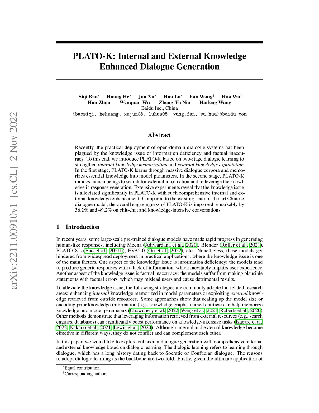 PLATO-K: Internal and External Knowledge Enhanced Dialogue Generation