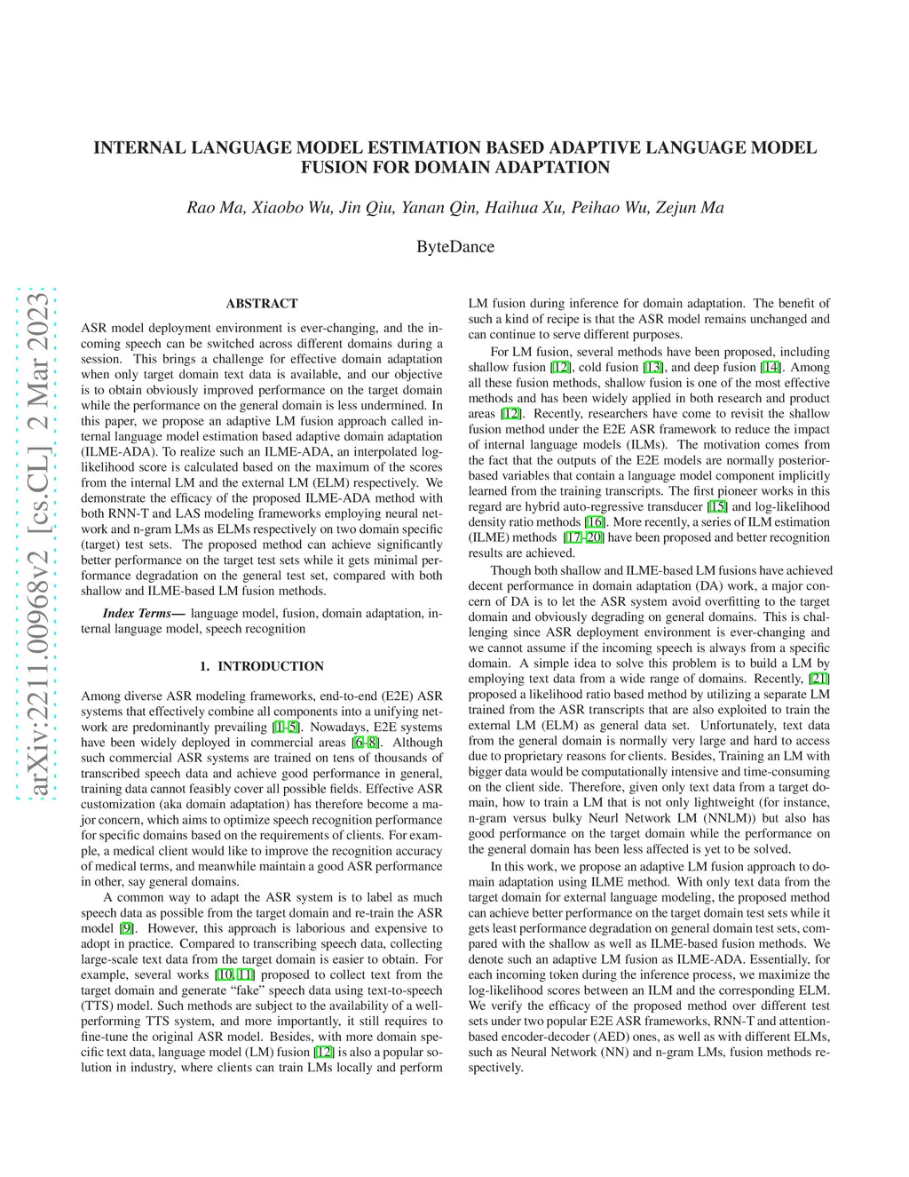 ASR model deployment environment is ever-changing, and the incoming speech can be switched across different domains during a session. This brings a challenge for effective domain adaptation when only target domain text data is available, and our objective is to obtain obviously improved performance on the target domain while the performance on the general domain is less undermined. In this paper, we propose an adaptive LM fusion approach called internal language model estimation based adaptive domain adaptation (ILME-ADA). To realize such an ILME-ADA, an interpolated log-likelihood score is calculated based on the maximum of the scores from the internal LM and the external LM (ELM) respectively. We demonstrate the efficacy of the proposed ILME-ADA method with both RNN-T and LAS modeling frameworks employing neural network and n-gram LMs as ELMs respectively on two domain specific (target) test sets. The proposed method can achieve significantly better performance on the target test sets while it gets minimal performance degradation on the general test set, compared with both shallow and ILME-based LM fusion methods.
